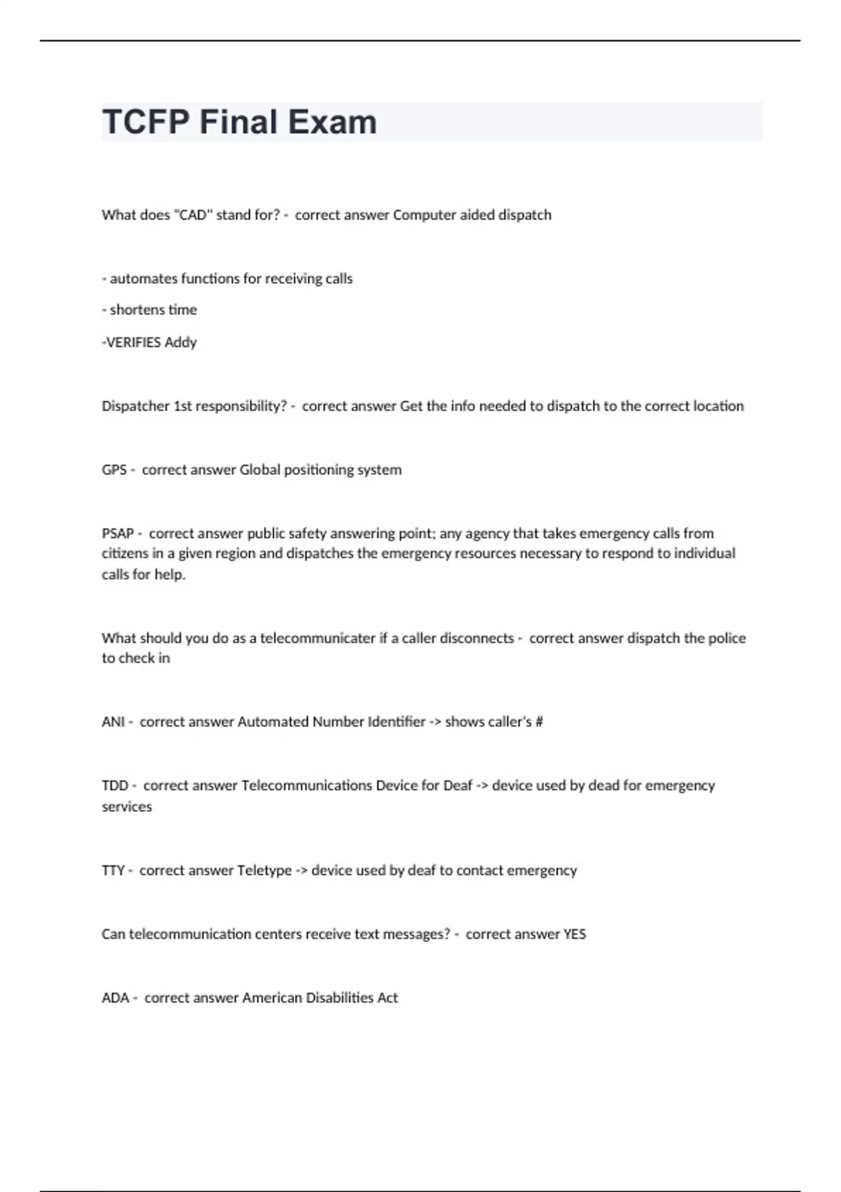 TCFP Final ExamWhat does "CAD" stand for? - correct answer Computer aided dispatch - automates functions for receiving calls - shortens time -VERIFIES Addy Dispatcher 1st responsibility? - correct answer Get the info needed to dispatch to the correct location GPS - correct answer Global positioning system PSAP - correct answer public safety answering point; any agency that takes emergency calls from citizens in a given region and dispatches the emergency resources necessary to respond to individual calls for help. What should you do as a telecommunicater if a caller disconnects - correct answer dispatch the police to check in ANI - correct answer Automated Number Identifier -> shows caller's # TDD - correct answer Telecommunications Device for Deaf -> device used by dead for emergency services TTY - correct answer Teletype -> device used by deaf to contact emergency Can telecommunication centers receive text messages? - correct answer YES ADA - correct answer American Disabilities Act