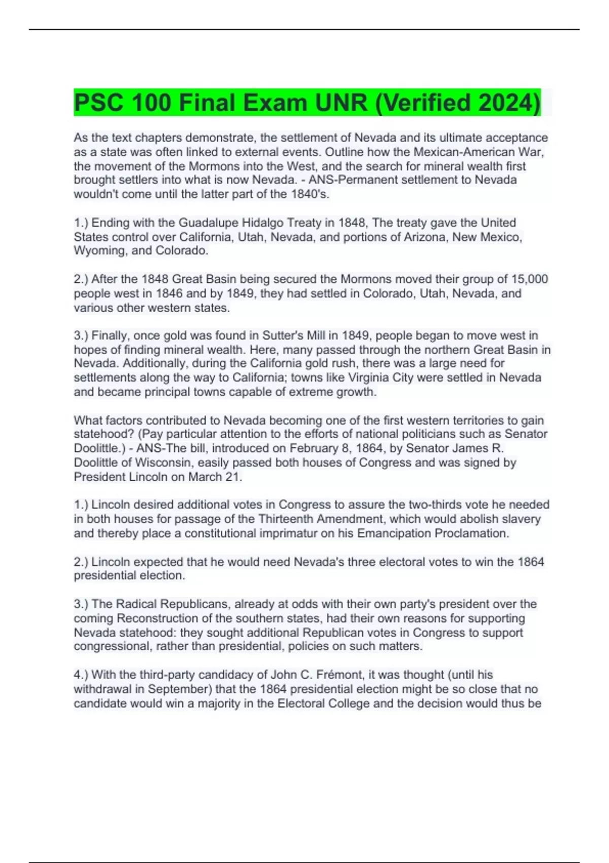PSC 100 Final Exam UNR (Verified 2024)