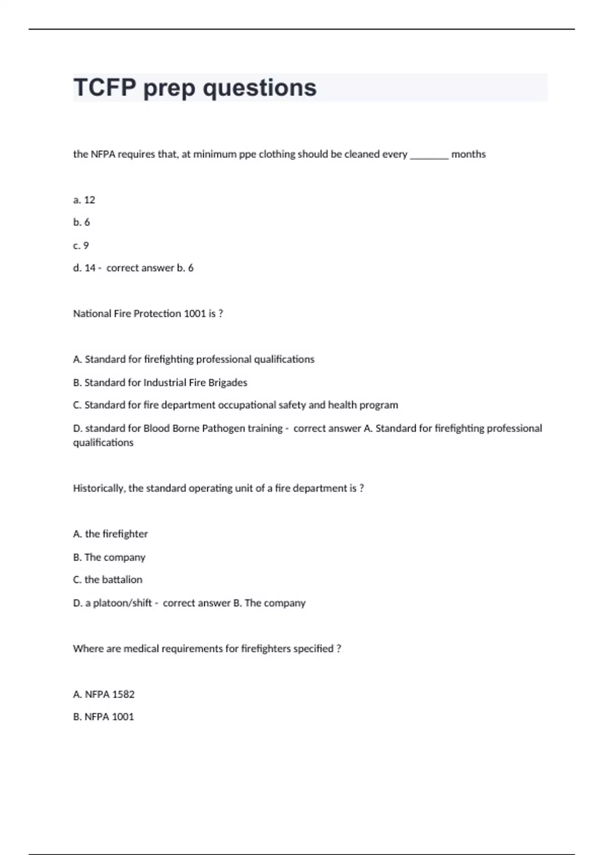 TCFP prep questions the NFPA requires that, at minimum ppe clothing should be cleaned every _______ months a. 12 b. 6 c. 9 d. 14 - correct answer b. 6 National Fire Protection 1001 is ? A. Standard for firefighting professional qualifications B. Standard for Industrial Fire Brigades C. Standard for fire department occupational safety and health program D. standard for Blood Borne Pathogen training - correct answer A. Standard for firefighting professional qualifications Historically, the standard operating unit of a fire department is ? A. the firefighter B. The company C. the battalion D. a platoon/shift - correct answer B. The company Where are medical requirements for firefighters specified ? A. NFPA 1582 B. NFPA 1001
