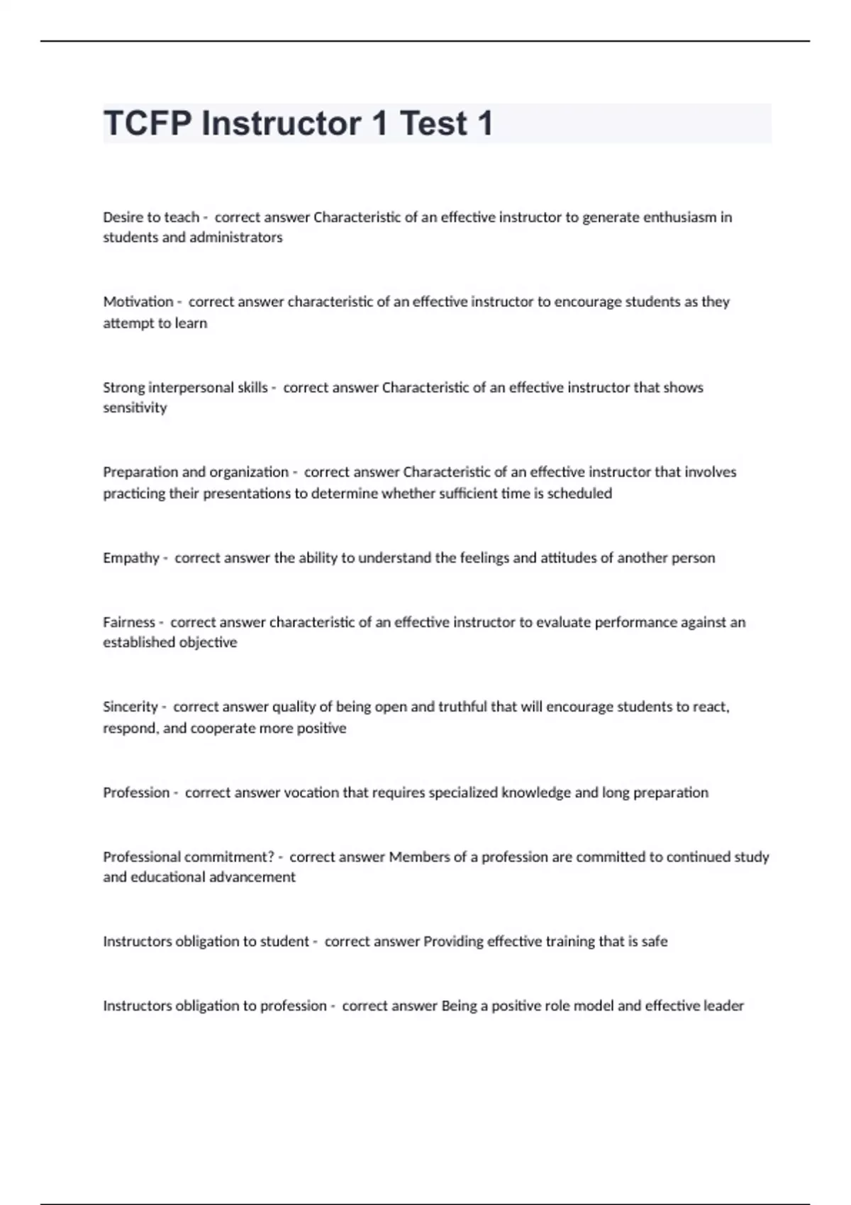 TCFP Instructor 1 Test 1 Desire to teach - correct answer Characteristic of an effective instructor to generate enthusiasm in students and administrators Motivation - correct answer characteristic of an effective instructor to encourage students as they attempt to learn Strong interpersonal skills - correct answer Characteristic of an effective instructor that shows sensitivity Preparation and organization - correct answer Characteristic of an effective instructor that involves practicing their presentations to determine whether sufficient time is scheduled Empathy - correct answer the ability to understand the feelings and attitudes of another person Fairness - correct answer characteristic of an effective instructor to evaluate performance against an established objective Sincerity - correct answer quality of being open and truthful that will encourage students to react, respond, and cooperate more positive Profession - correct answer vocation that requires specialized knowledge and long preparation Professional commitment? - correct answer Members of a profession are committed to continued study and educational advancement Instructors obligation to student - correct answer Providing effective training that is safe Instructors obligation to profession - correct answer Being a positive role model and effective leader