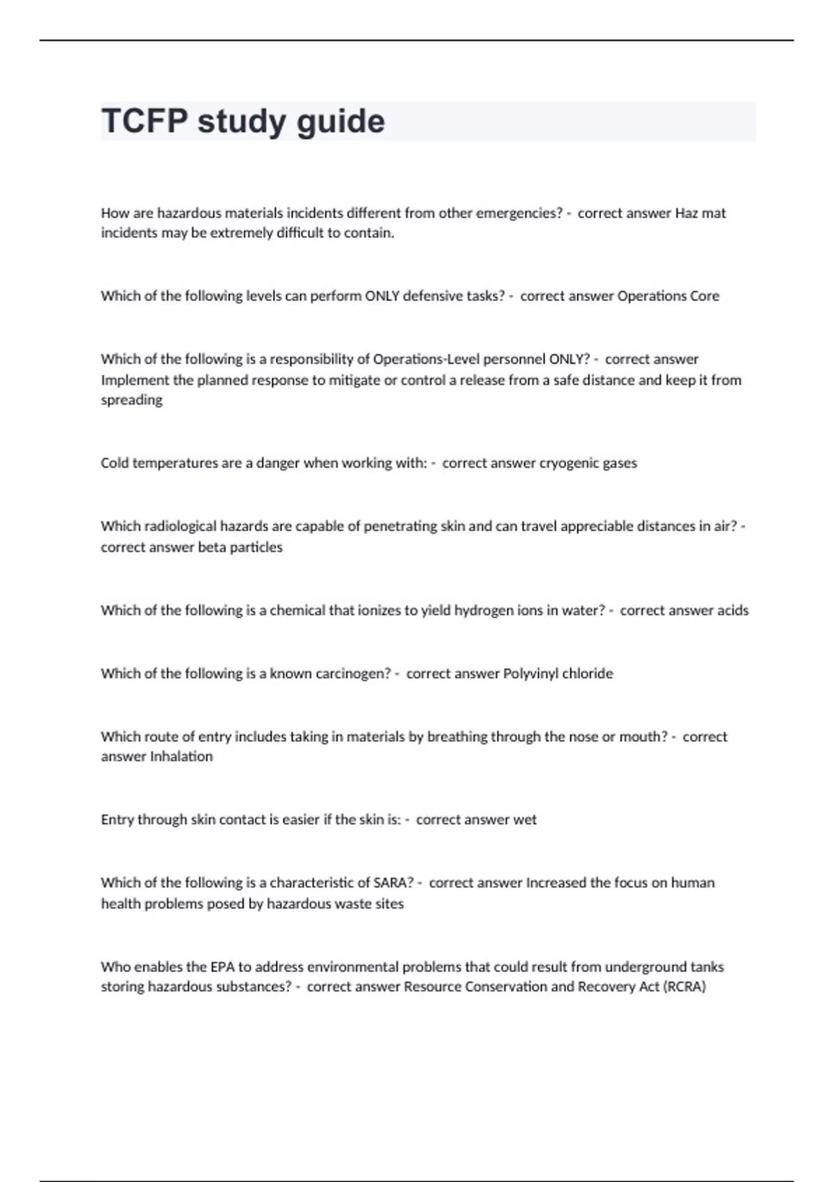 TCFP study guide How are hazardous materials incidents different from other emergencies? - correct answer Haz mat incidents may be extremely difficult to contain. Which of the following levels can perform ONLY defensive tasks? - correct answer Operations Core Which of the following is a responsibility of Operations-Level personnel ONLY? - correct answer Implement the planned response to mitigate or control a release from a safe distance and keep it from spreading Cold temperatures are a danger when working with: - correct answer cryogenic gases Which radiological hazards are capable of penetrating skin and can travel appreciable distances in air? - correct answer beta particles Which of the following is a chemical that ionizes to yield hydrogen ions in water? - correct answer acids Which of the following is a known carcinogen? - correct answer Polyvinyl chloride Which route of entry includes taking in materials by breathing through the nose or mouth? - correct answer Inhalation Entry through skin contact is easier if the skin is: - correct answer wet Which of the following is a characteristic of SARA? - correct answer Increased the focus on human health problems posed by hazardous waste sites Who enables the EPA to address environmental problems that could result from underground tanks storing hazardous substances? - correct answer Resource Conservation and Recovery Act (RCRA)