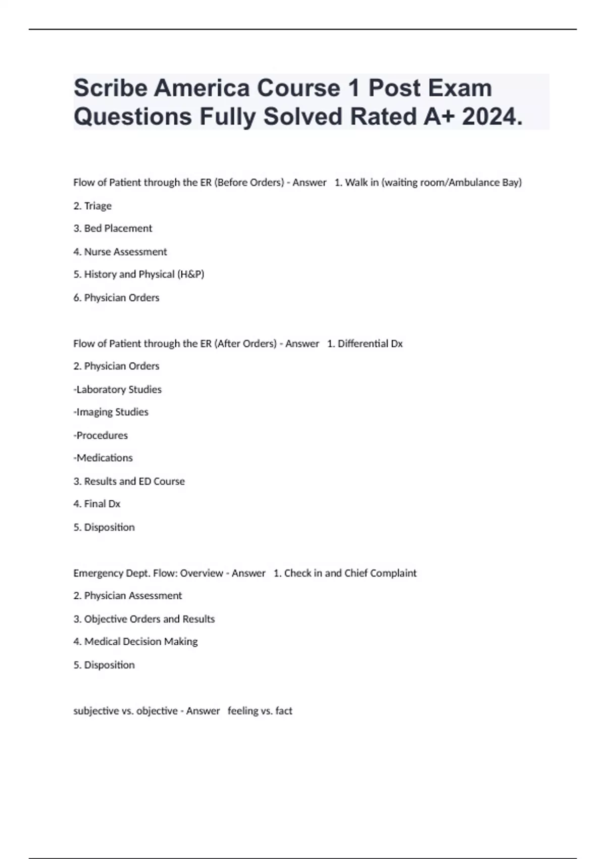 Flow of Patient through the ER (Before Orders) - Answer 1. Walk in (waiting room/Ambulance Bay) 2. Triage 3. Bed Placement 4. Nurse Assessment 5. History and Physical (H&P) 6. Physician Orders Flow of Patient through the ER (After Orders) - Answer 1. Differential Dx 2. Physician Orders -Laboratory Studies -Imaging Studies -Procedures -Medications 3. Results and ED Course 4. Final Dx 5. Disposition Emergency Dept. Flow: Overview - Answer 1. Check in and Chief Complaint 2. Physician Assessment 3. Objective Orders and Results 4. Medical Decision Making 5. Disposition subjective vs. objective - Answer feeling vs. fact