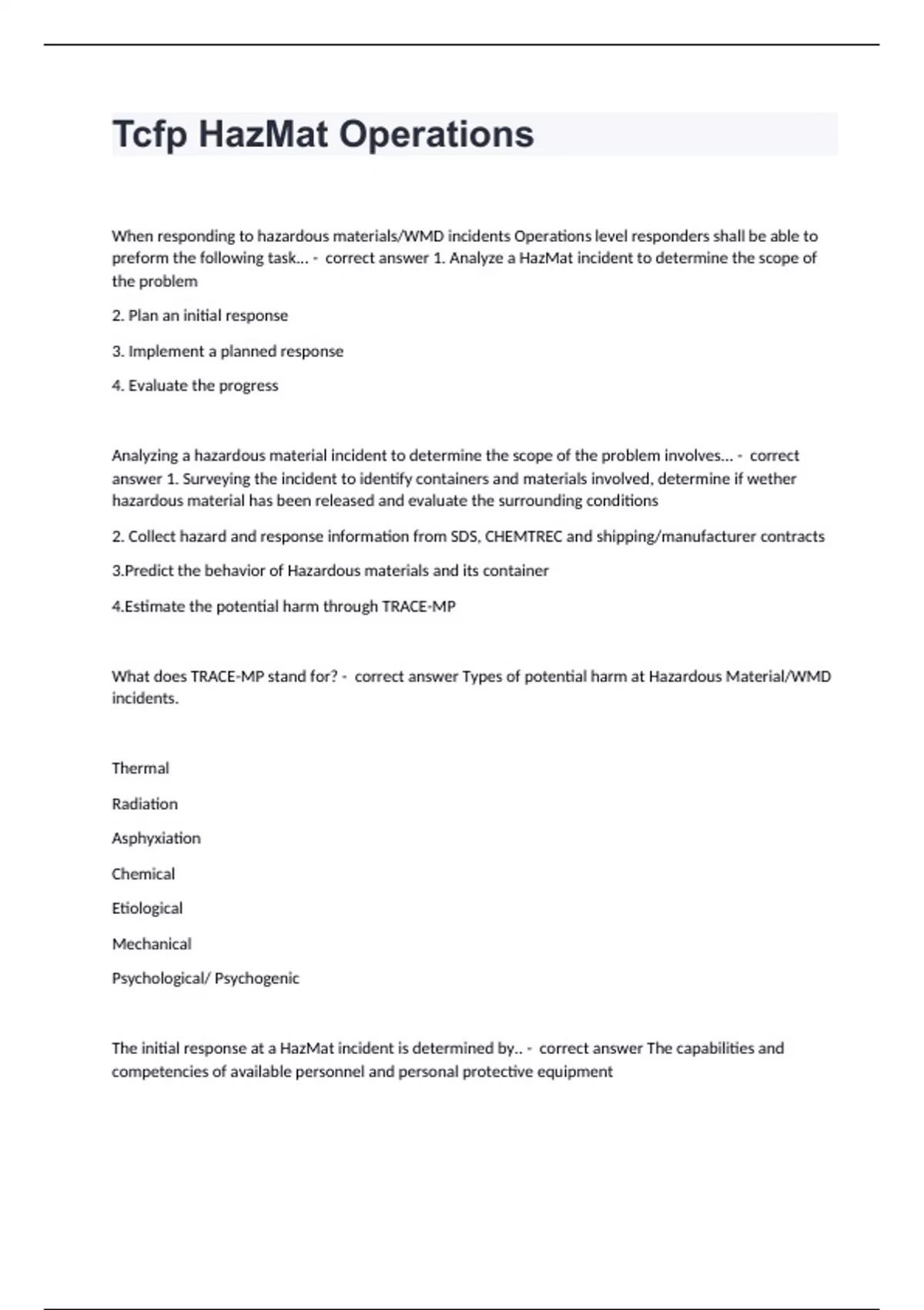 Tcfp HazMat OperationsWhen responding to hazardous materials/WMD incidents Operations level responders shall be able to preform the following task... - correct answer 1. Analyze a HazMat incident to determine the scope of the problem 2. Plan an initial response 3. Implement a planned response 4. Evaluate the progress Analyzing a hazardous material incident to determine the scope of the problem involves... - correct answer 1. Surveying the incident to identify containers and materials involved, determine if wether hazardous material has been released and evaluate the surrounding conditions 2. Collect hazard and response information from SDS, CHEMTREC and shipping/manufacturer contracts 3.Predict the behavior of Hazardous materials and its container 4.Estimate the potential harm through TRACE-MP What does TRACE-MP stand for? - correct answer Types of potential harm at Hazardous Material/WMD incidents. Thermal Radiation Asphyxiation Chemical Etiological Mechanical Psychological/ Psychogenic The initial response at a HazMat incident is determined by.. - correct answer The capabilities and competencies of available personnel and personal protective equipment
