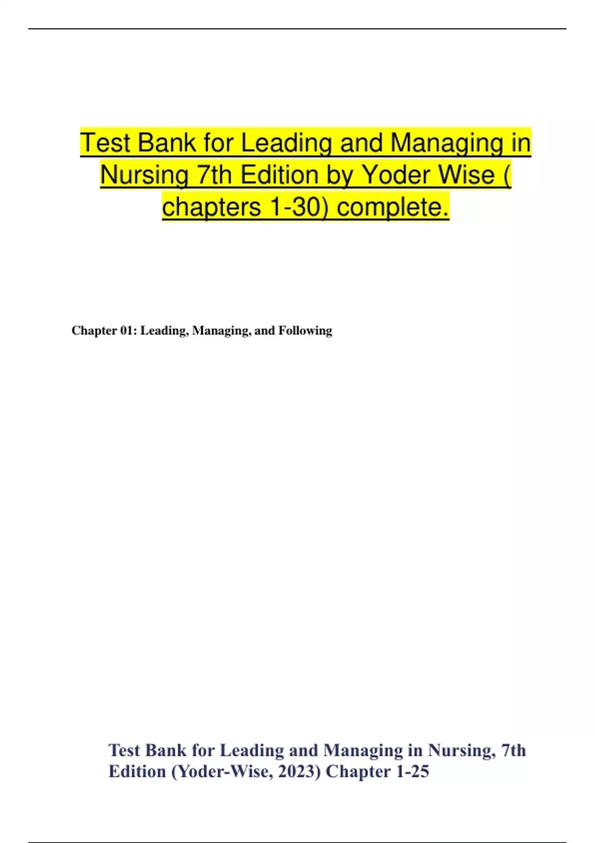 Test Bank for Leading and Managing in Nursing, 7th Edition (Yoder-Wise, 2023) Chapter 1-25