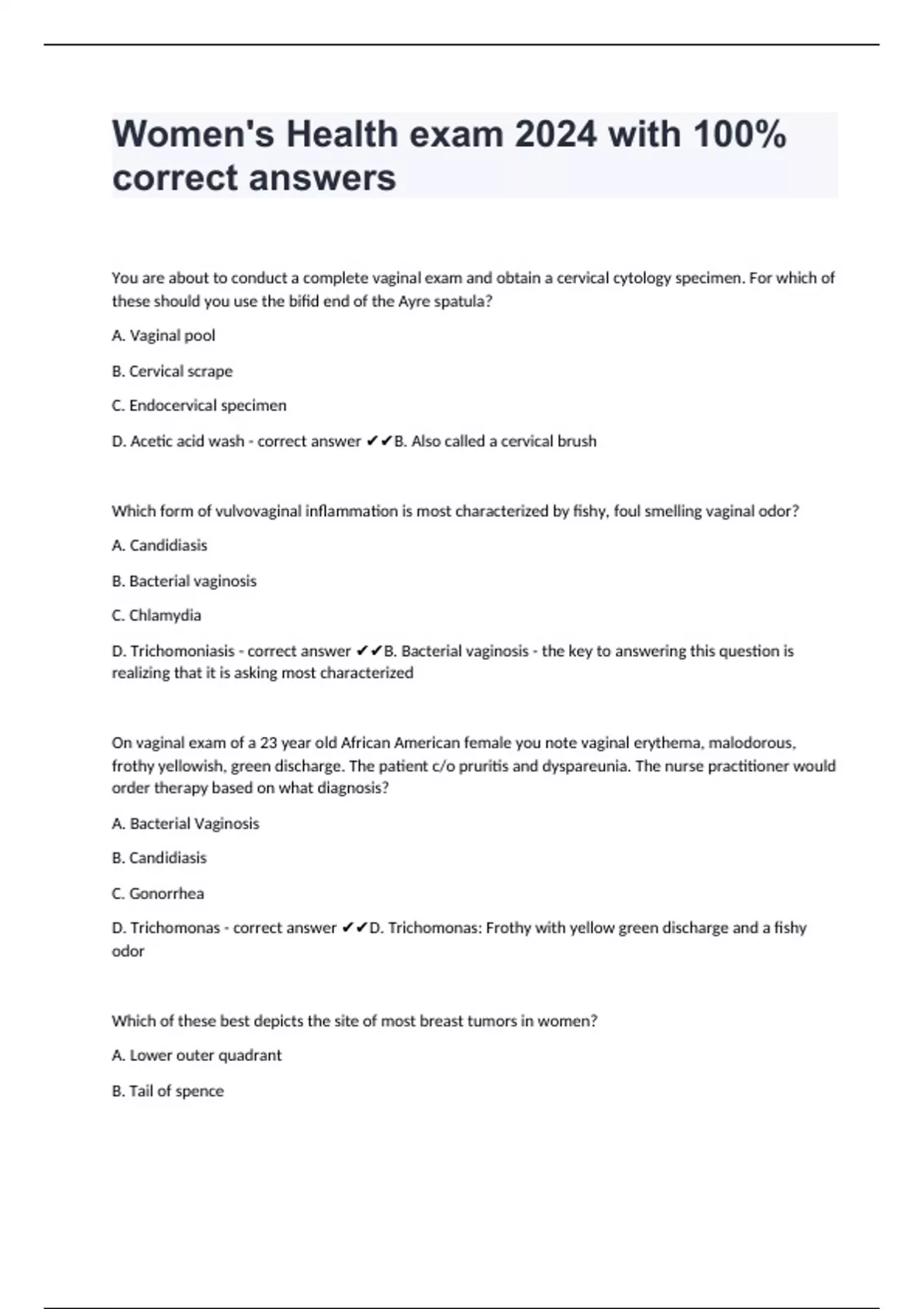 You are about to conduct a complete vaginal exam and obtain a cervical cytology specimen. For which of these should you use the bifid end of the Ayre spatula? A. Vaginal pool B. Cervical scrape C. Endocervical specimen D. Acetic acid wash - correct answer B. Also called a cervical brush Which form of vulvovaginal inflammation is most characterized by fishy, foul smelling vaginal odor? A. Candidiasis B. Bacterial vaginosis C. Chlamydia D. Trichomoniasis - correct answer B. Bacterial vaginosis - the key to answering this question is realizing that it is asking most characterized On vaginal exam of a 23 year old African American female you note vaginal erythema, malodorous, frothy yellowish, green discharge. The patient c/o pruritis and dyspareunia. The nurse practitioner would order therapy based on what diagnosis? A. Bacterial Vaginosis B. Candidiasis C. Gonorrhea D. Trichomonas - correct answer D. Trichomonas: Frothy with yellow green discharge and a fishy odor Which of these best depicts the site of most breast tumors in women? A. Lower outer quadrant B. Tail of spence C. Upp