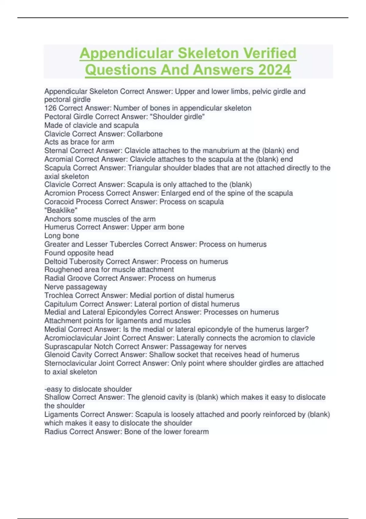 APPENDICULAR ANATOMY VERIFIED QUESTIONS AND ANSWERS PACKAGE 2024 GREAT DEAL