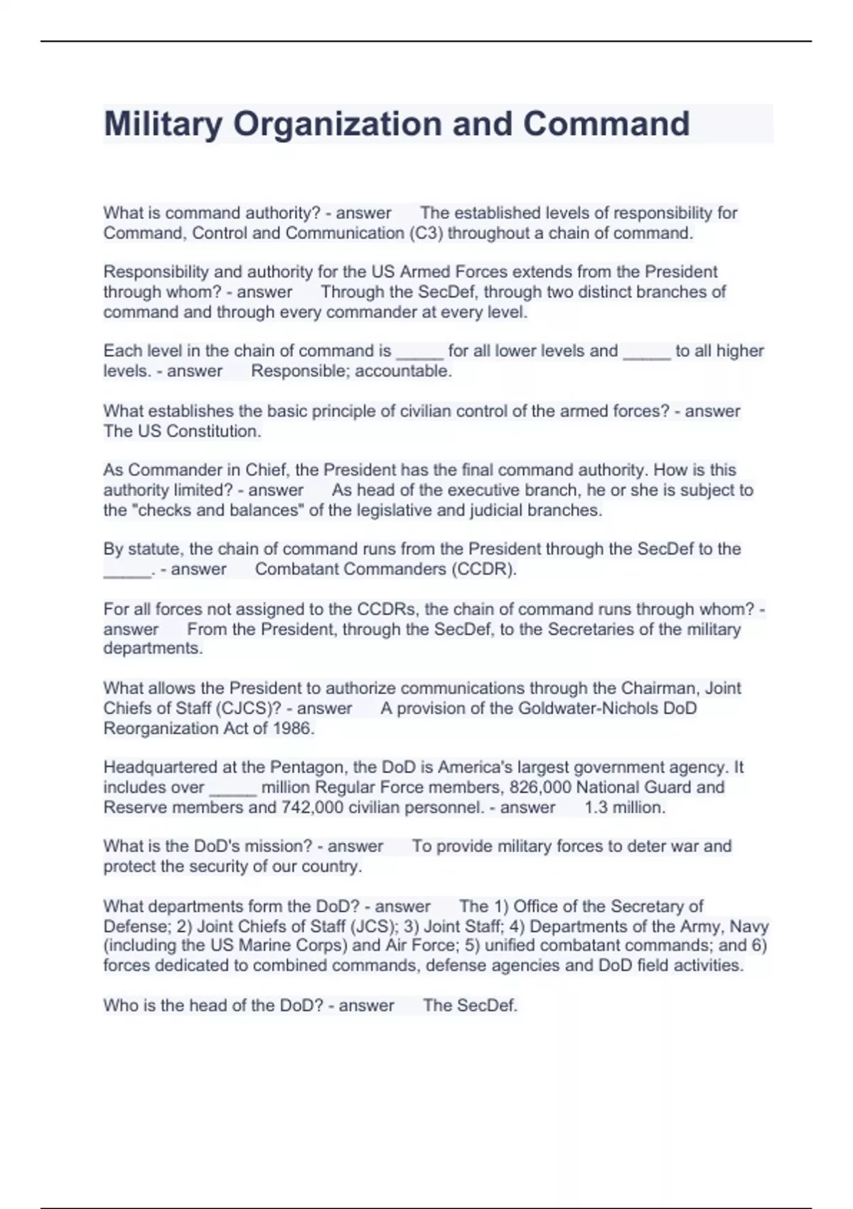Military Organization and Command Questions and Answers 2024