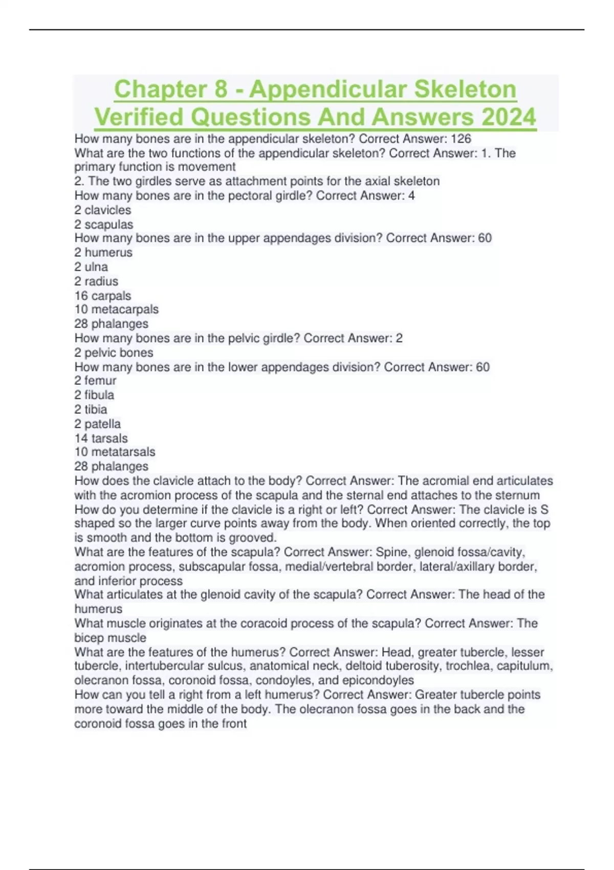 Chapter 8 - Appendicular Skeleton Verified Questions And Answers 2024 Chapter 8 - Appendicular Skeleton Verified Questions And Answers 2024