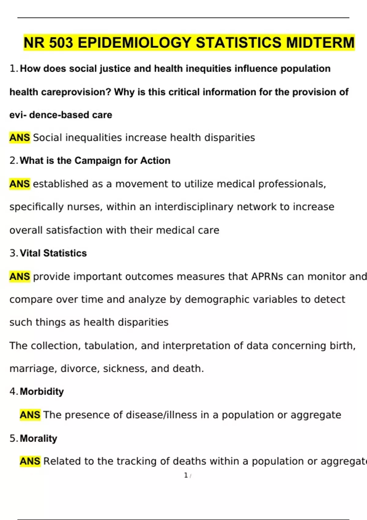 1. How does social justice and health inequities influence population health careprovision? Why is this critical information for the provision of evi- dence-based care ANS Social inequalities increase health disparities 2. What is the Campaign for Action ANS established as a movement to utilize medical professionals, specifically nurses, within an interdisciplinary network to increase overall satisfaction with their medical care 3. Vital Statistics ANS provide important outcomes measures that APRNs can monitor and compare over time and analyze by demographic variables to detect such things as health disparities The collection, tabulation, and interpretation of data concerning birth, marriage, divorce, sickness, and death. 4. Morbidity ANS The presence of disease/illness in a population or aggregate 5. Morality ANS Related to the tracking of deaths within a population or aggregate