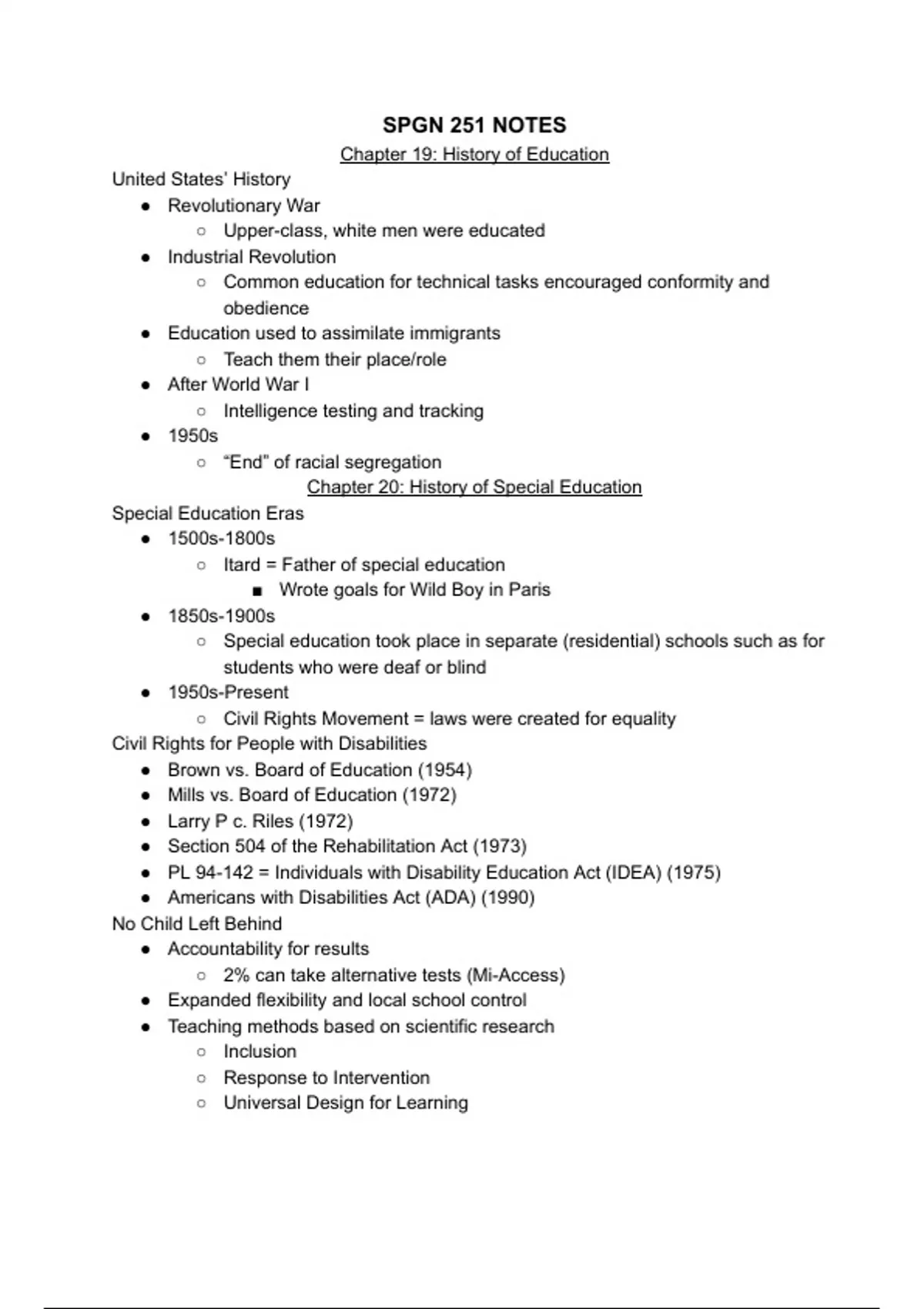 SPGN 251: Introduction to Inclusion and Disabilities Studies in a Diverse Society is a course offered at Eastern Michigan University that many education and music therapy majors are required to take. I unfortunately cannot find which textbook I took these notes from, but it is the same as what will be expected for the students of this course to read. I am charging $1 per page, for a total of $6.5o (there are about 6.5 pages of notes in total). All sales support me as I move onto internship from my undergraduate studies and take my CBMT exam.