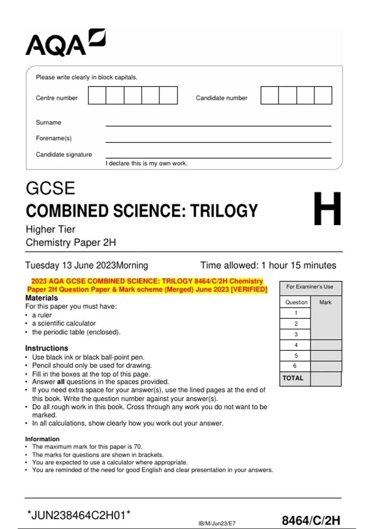 2023 AQA GCSE COMBINED SCIENCE: TRILOGY 8464/C/2H Chemistry Paper 2H Question Paper & Mark scheme (Merged) June 2023 [VERIFIED]