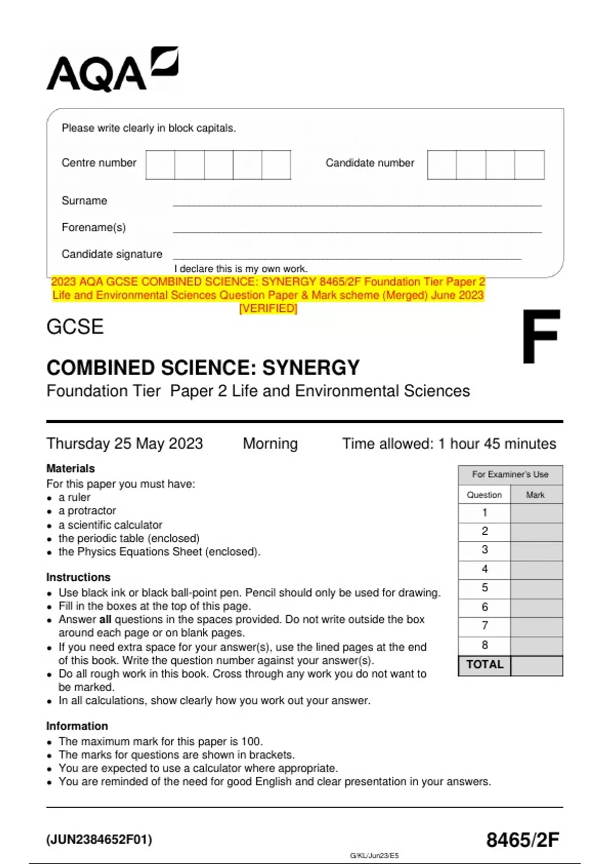 2023 AQA GCSE COMBINED SCIENCE: SYNERGY 8465/2F Foundation Tier Paper 2 Life and Environmental Sciences Question Paper & Mark scheme (Merged) June 2023 [VERIFIED]
