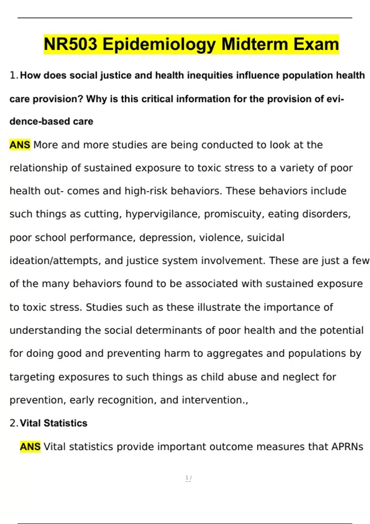 1. How does social justice and health inequities influence population health care provision? Why is this critical information for the provision of evi- dence-based care ANS More and more studies are being conducted to look at the relationship of sustained exposure to toxic stress to a variety of poor health out- comes and high-risk behaviors. These behaviors include such things as cutting, hypervigilance, promiscuity, eating disorders, poor school performance, depression, violence, suicidal ideation/attempts, and justice system involvement. These are just a few of the many behaviors found to be associated with sustained exposure to toxic stress. Studies such as these illustrate the importance of understanding the social determinants of poor health and the potential for doing good and preventing harm to aggregates and populations by targeting exposures to such things as child abuse and neglect for prevention, early recognition, and intervention., 2. Vital Statistics ANS Vital statistics provide important outcome measures that APRNs can monitor and compare over time and analyze by demographic variables to detect such things as health disparities. In the United States, the National Center for Health Statistics (NCHS) collects the official records of births, deaths, marriages, divorces, fetal deaths, and induced terminations of pregnancies from state and local health departments (Aschengrau & Seage, 2013). Personnel from local health departments review the data from death certificates, including demographic data, looking at the immediate cause of death and any contributing factors of death, and recording multiple causes of death. Local data are sent to a state office for collation and then sent to the NCHS, which provides this information to the public on its website (http//