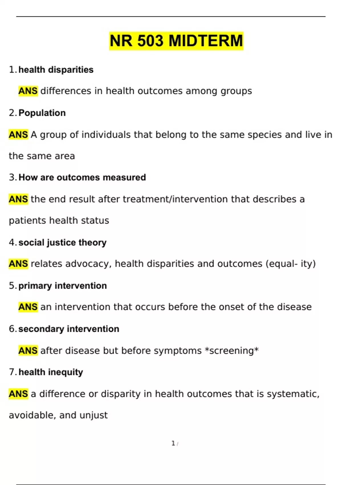 1. health disparities ANS differences in health outcomes among groups 2. Population ANS A group of individuals that belong to the same species and live in the same area 3. How are outcomes measured ANS the end result after treatment/intervention that describes a patients health status 4. social justice theory ANS relates advocacy, health disparities and outcomes (equal- ity) 5. primary intervention ANS an intervention that occurs before the onset of the disease 6. secondary intervention ANS after disease but before symptoms *screening* 7. health inequity ANS a difference or disparity in health outcomes that is systematic, avoidable, and unjust 8. Social Justice ANS the defense of human dignity by ensuring that essential human needs are met and that essential human rights are protected for all people 9. Campaign for Action ANS limit health disparities across the nation