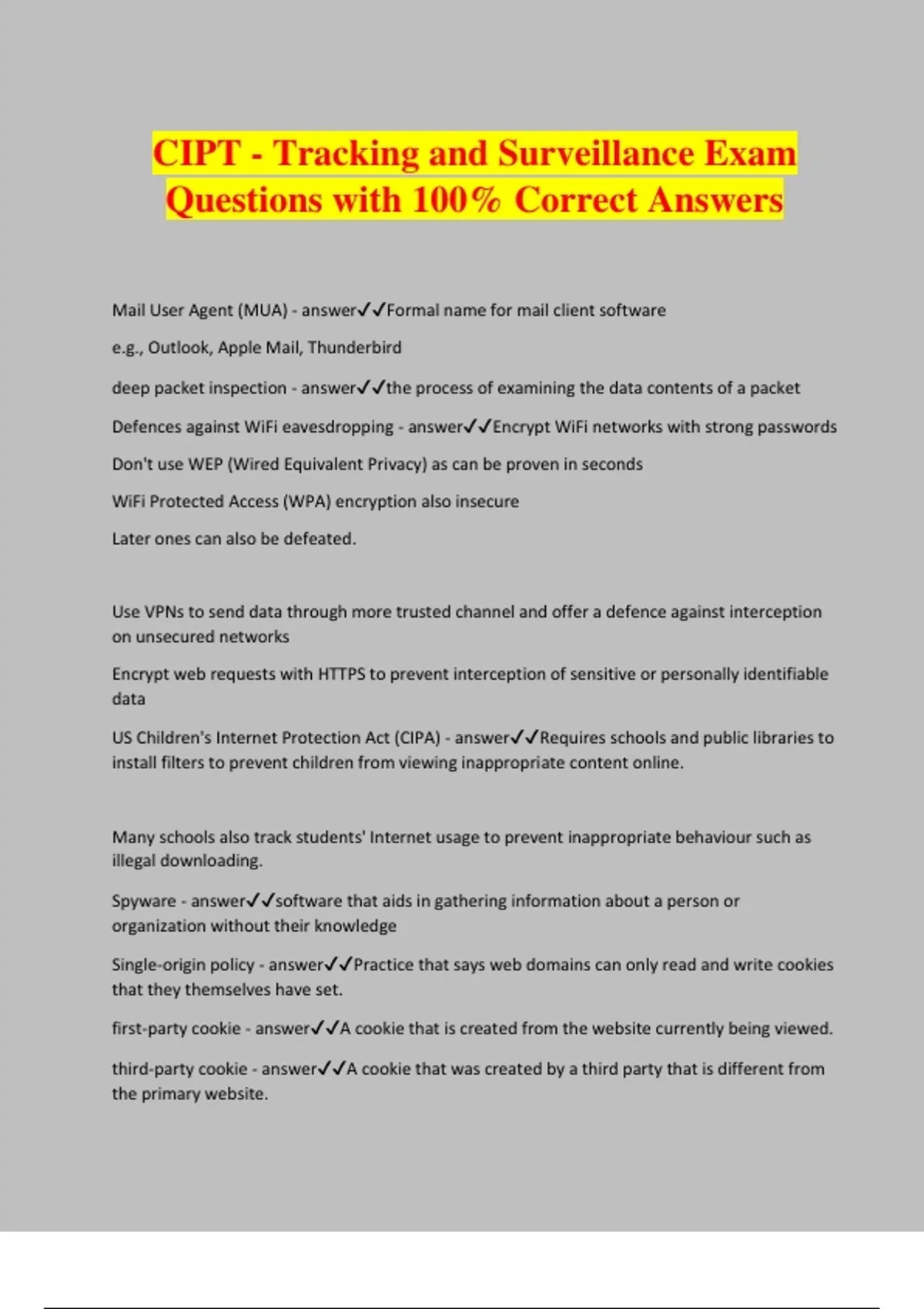 CIPT - Tracking and Surveillance Exam Questions with 100% Correct Answers Mail User Agent (MUA) - answerFormal name for mail client software e.g., Outlook, Apple Mail, Thunderbird deep packet inspection - answerthe process of examining the data contents of a packet Defences against WiFi eavesdropping - answerEncrypt WiFi networks with strong passwords Don't use WEP (Wired Equivalent Privacy) as can be proven in seconds WiFi Protected Access (WPA) encryption also insecure Later ones can also be defeated. Use VPNs to send data through more trusted channel and offer a defence against interception on unsecured networks Encrypt web requests with HTTPS to prevent interception of sensitive or personally identifiable data US Children's Internet Protection Act (CIPA) - answerRequires schools and public libraries to install filters to prevent children from viewing inappropriate content online. Many schools also track students' Internet usage to prevent inappropriate behaviour such as illegal downloading. Spyware - answersoftware that aids in gathering information about a person or organization without their knowledge
