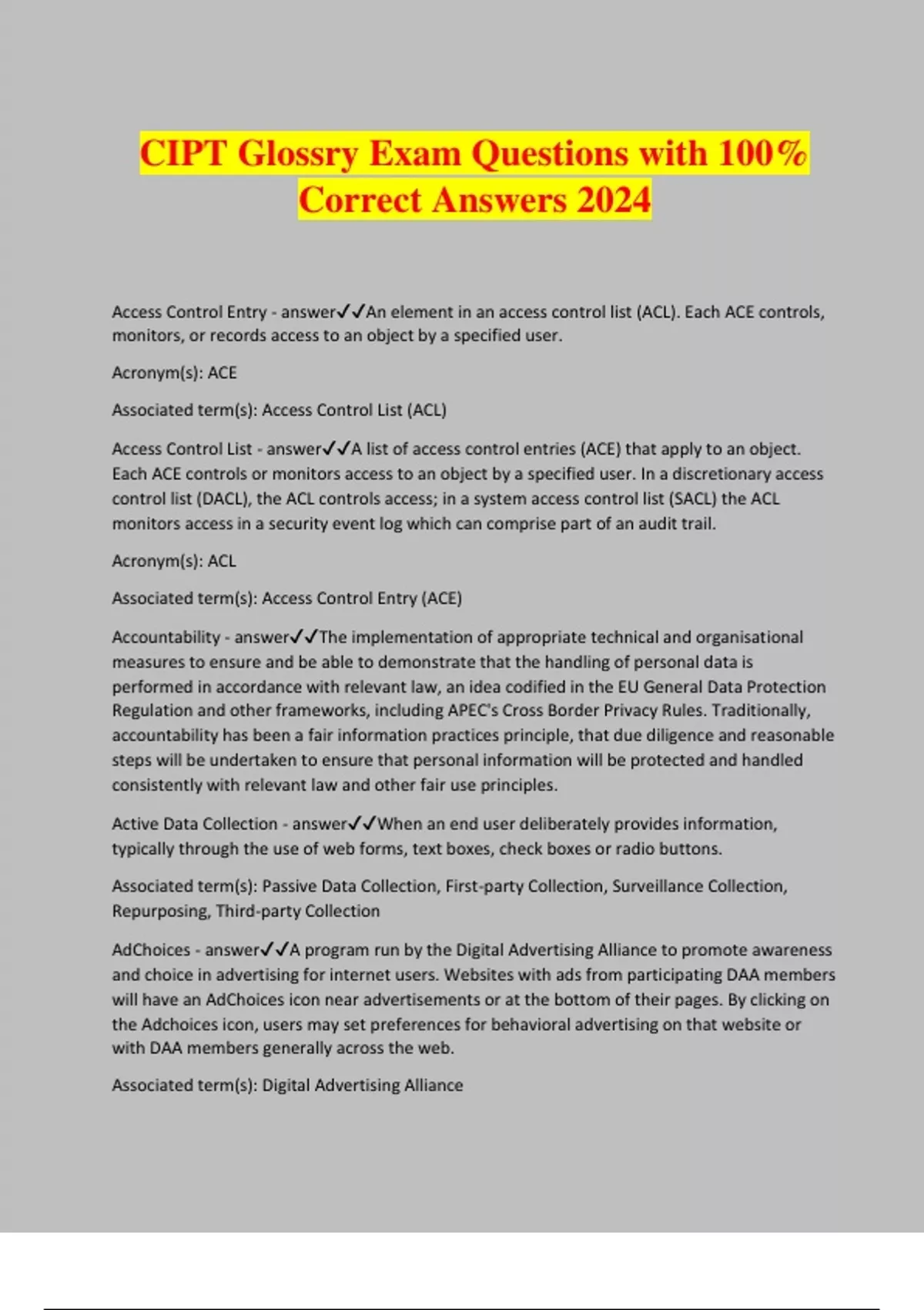 CIPT Glossry Exam Questions with 100% Correct Answers 2024