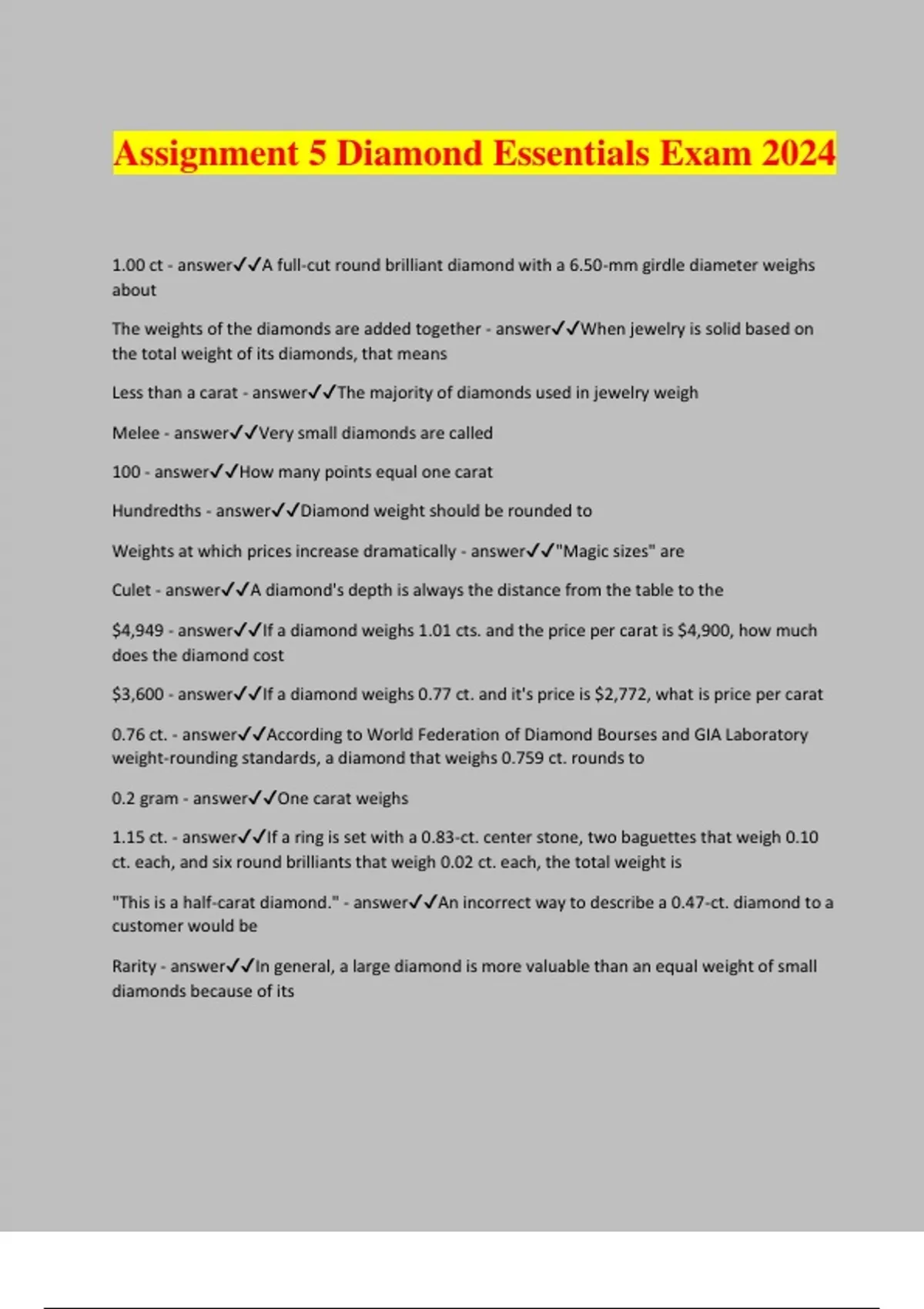 Assignment 5 Diamond Essentials Exam 2024 1.00 ct - answerA full-cut round brilliant diamond with a 6.50-mm girdle diameter weighs about The weights of the diamonds are added together - answerWhen jewelry is solid based on the total weight of its diamonds, that means Less than a carat - answerThe majority of diamonds used in jewelry weigh Melee - answerVery small diamonds are called 100 - answerHow many points equal one carat Hundredths - answerDiamond weight should be rounded to Weights at which prices increase dramatically - answer"Magic sizes" are Culet - answerA diamond's depth is always the distance from the table to the