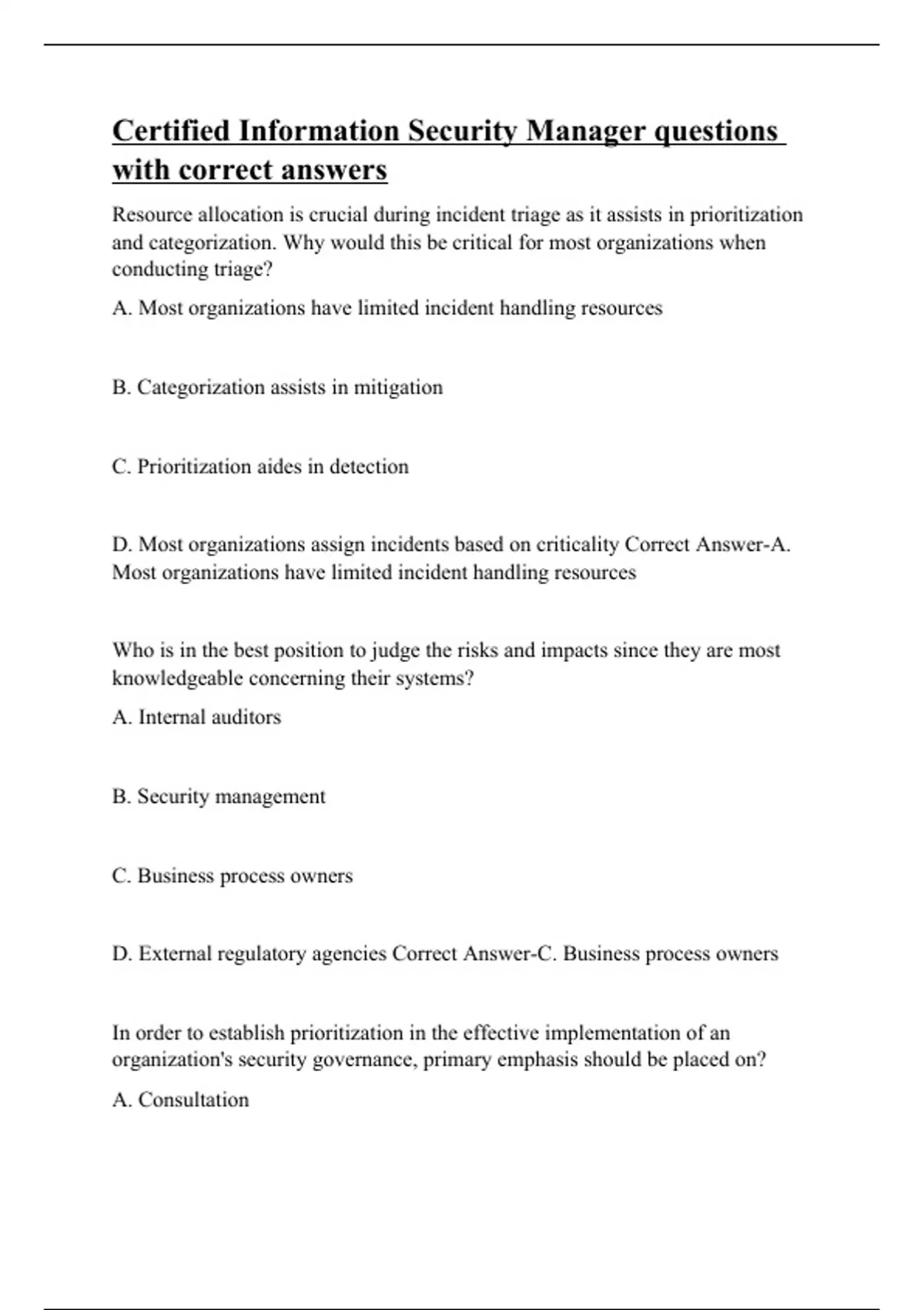 Resource allocation is crucial during incident triage as it assists in prioritization and categorization. Why would this be critical for most organizations when conducting triage? A. Most organizations have limited incident handling resources B. Categorization assists in mitigation C. Prioritization aides in detection D. Most organizations assign incidents based on criticality Correct Answer-A. Most organizations have limited incident handling resources Who is in the best position to judge the risks and impacts since they are most knowledgeable concerning their systems? A. Internal auditors B. Security management C. Business process owners D. External regulatory agencies Correct Answer-C. Business process owners In order to establish prioritization in the effective implementation of an organization's security governance, primary em