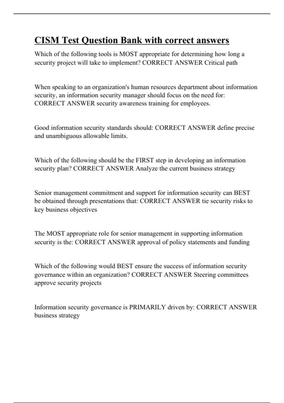 CISM Test Question Bank with correct answers