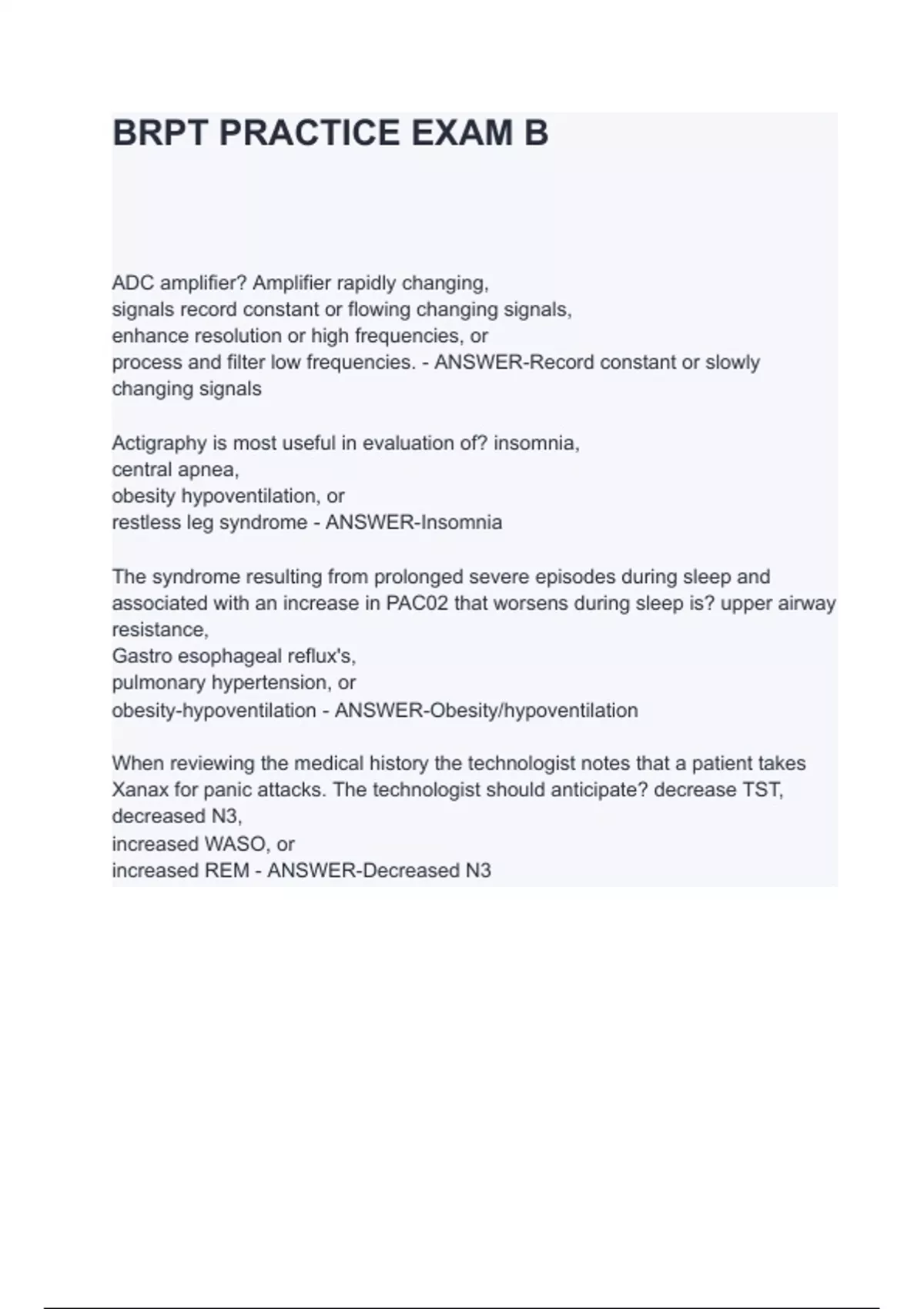 ADC amplifier? Amplifier rapidly changing, signals record constant or flowing changing signals, enhance resolution or high frequencies, or process and filter low frequencies. - ANSWER-Record constant or slowly changing signals Actigraphy is most useful in evaluation of? insomnia, central apnea, obesity hypoventilation, or restless leg syndrome - ANSWER-Insomnia The syndrome resulting from prolonged severe episodes during sleep and associated with an increase in PAC02 that worsens during sleep is? upper airway resistance, Gastro esophageal reflux's, pulmonary hypertension, or obesity-hypoventilation -