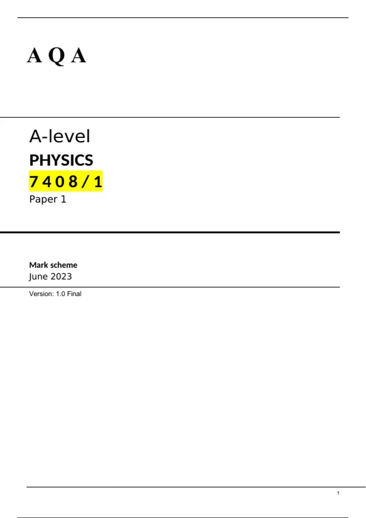 AQA A LEVEL Physics paper 1 Mark-scheme June 2023