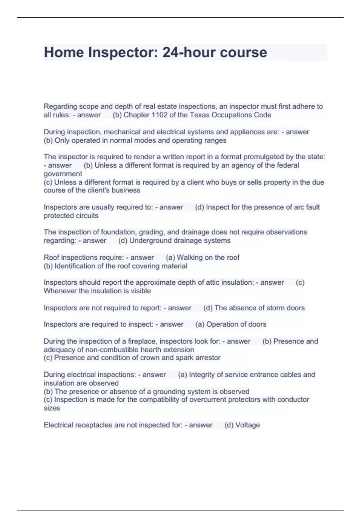 Home Inspector. 24-hour course Questions with correct 2024