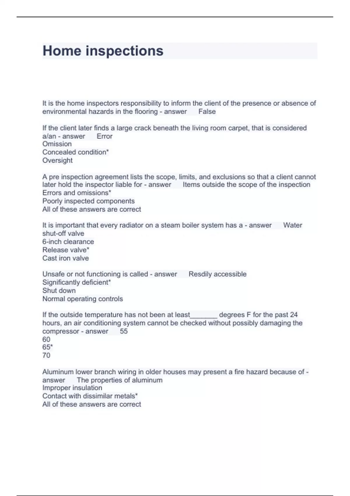Home inspections Questions with correct Answers 100%
