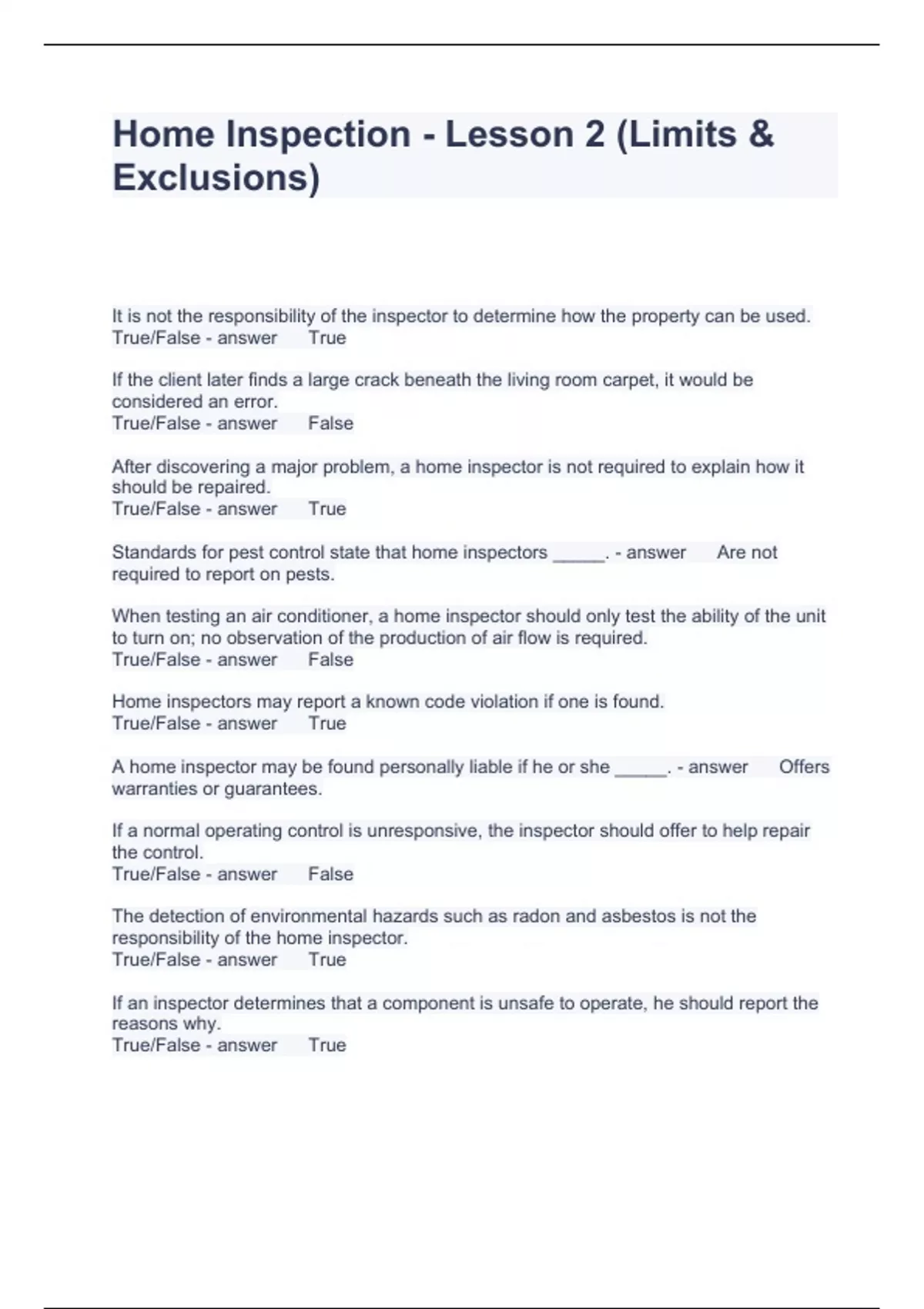 Home Inspection - Lesson 2 (Limits & Exclusions) Questions and Answers 100% correct