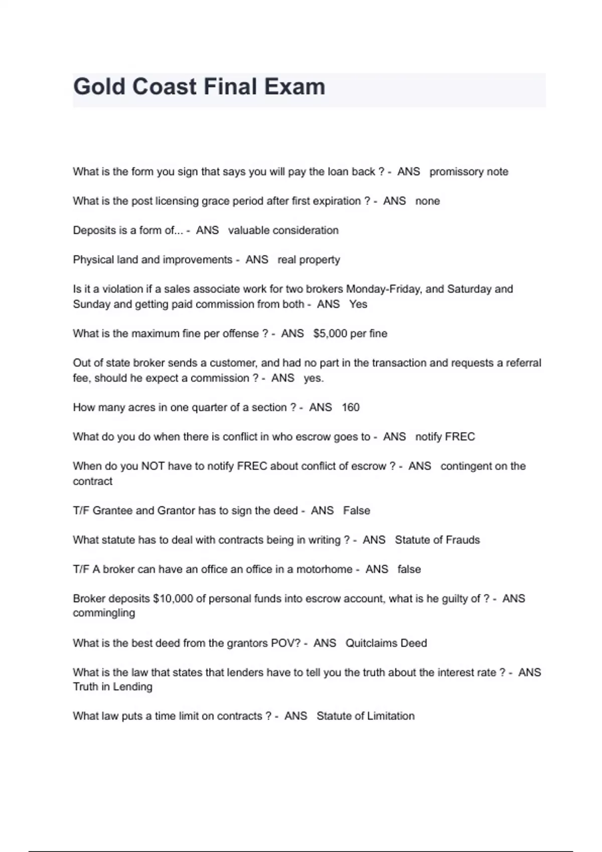 Gold Coast Final Exam Questions And Answers What is the form you sign that says you will pay the loan back ? - ANS promissory note What is the post licensing grace period after first expiration ? - ANS none Deposits is a form of... - ANS valuable consideration Physical land and improvements - ANS real property Is it a violation if a sales associate work for two brokers Monday-Friday, and Saturday and Sunday and getting paid commission from both - ANS Yes What is the maximum fine per offense ? - ANS $5,000 per fine Out of state broker sends a customer, and had no part in the transaction and requests a referral fee, should he expect a commission ? - ANS yes. How many acres in one quarter of a section ? - ANS 160 What do you do when there is conflict in who escrow goes to - ANS notify FREC When do you NOT have to notify FREC about conflict of escrow ? - ANS contingent on the contract T/F Grantee and Grantor has to sign the deed - ANS False What statute has to deal with contracts being in writing ? - ANS Statute of Frauds T/F A broker can have an office an office in a motorhome - ANS false