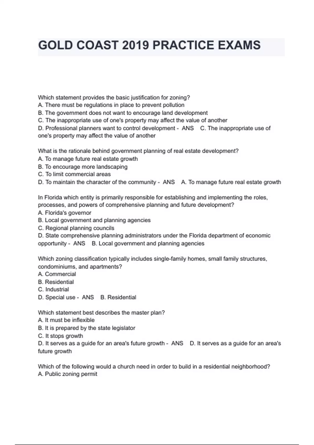 GOLD COAST 2019 PRACTICE EXAMS Which statement provides the basic justification for zoning? A. There must be regulations in place to prevent pollution B. The government does not want to encourage land development C. The inappropriate use of one's property may affect the value of another D. Professional planners want to control development - ANS C. The inappropriate use of one's property may affect the value of another What is the rationale behind government planning of real estate development? A. To manage future real estate growth B. To encourage more landscaping C. To limit commercial areas D. To maintain the character of the community - ANS A. To manage future real estate growth In Florida which entity is primarily responsible for establishing and implementing the roles, processes, and powers of comprehensive planning and future development? A. Florida's governor B. Local government and planning agencies C. Regional planning councils D. State comprehensive planning administrators under the Florida department of economic opportunity - ANS B. Local government and planning agencies Which zoning classification typically includes single-family homes, small family structures, condominiums, and apartments? A. Commercial B. Residential C. Industrial D. Special use - ANS B. Residential Which statement best describes the master plan? A. It must be inflexible B. It is prepared by the state legislator C. It stops growth D. It serves as a guide for an area's future growth - ANS D. It serves as a guide for an area's future growth Which of the following would a church need in order to build in a residential neighborhood? A. Public zoning permit B. Special exception C. Variance D. Nonconforming use permit - ANS B. Special exception What is the purpose of the zoning board of adjustment? A. To settle monetary claims by property owners B. To grant variances and special exceptions C. To develop the comprehensive plan D. To determine infrastructure requirements - ANS B. To grant variances and special exceptions Which term is used to describe a property use that predates the current zoning ordinance but is allowed to exist for at least a period of time? A. Legally conforming B. Progressive C. Legally nonconforming D. Capitalized - ANS C. Legally nonconforming Which statement which best describes a Planned Unit Development (PUD)? A. A PUD offers fewer amenities than are possible with more traditional forms of zoning B. A PUD impacts the environment to a greater degree than most zoning classifications C. A PUD prohibits the use of zero lot line development D. A PUD is also called cluster zoning - ANS C. A PUD is also called cluster zoning Which statement is correct with respect to a Development of Regional Impact (DRI)? A. A DRI is defined as any development that substantially affects health, safety, or welfare of the citizens of more than one county B. The state of Florida as no authority concerning guidelines for development or review of a developments of regional impact C. The review process for a new DRI is concerned only with residential construction D. The federal government has no influence on local development - ANS A. A DRI is defined as any development that substantially affects health, safety or welfare of citizens of more than one county Adequate infrastructure available to support growth and development was mandated by Florida's Growth Management Act and is specified in which of the following? A. DRI reviews B. Concurrency rules C. County zoning ordinances D. Local building codes - ANS B. Concurrency rules What is the category of a business that meets payroll expense by using dollars a generated by persons who live in the immediate vicinity? A. Service B. Basic C. Export D. Regenerative - ANS A. Service Which of the following would be considered a basic industry when performing an economic base analysis. A. Florist shop B. Fire station C. University D. Movie theatre - ANS C. University With regard to residential properties located within a flood hazard Zone V, which statement is correct? A. Base-elevation requirements can be achieved by using fill dirt B. The structure use be on elevated construction C. Flood insurance is always required D. There is a 1 in 500 percent probability of a flood in any given year - ANS B. The structure must be on elevated construction Which standard or process establishes the minimum standards for design and construction of buildings or structures? A. Comprehensive planning D. DRI reviews C. Zoning D. Building codes - ANS D. Building codes To which organization is real estate tax most important? A. The federal government B. The state government C. The local government D. Local nonprofit organizations - ANS C. The local government What does the county property appraiser determine? A. Tax rate B. Market value C. Assessed value D. Just value - ANS C. Assessed value Which of the following statements best describes the Greenbelt laws? A. They limit the assessed value on agricultural land in or near urban areas B. They help to raise the tax base C. They provide for the best use of land D. They prevent land from being used for development - ANS A. They limit assessed value on agricultural land in or near urban areas What discount percentage is given to property owners who pay their real estate tax bill in November? A. 1% B. 2% C. 3% D. 4% - ANS D. 4%
