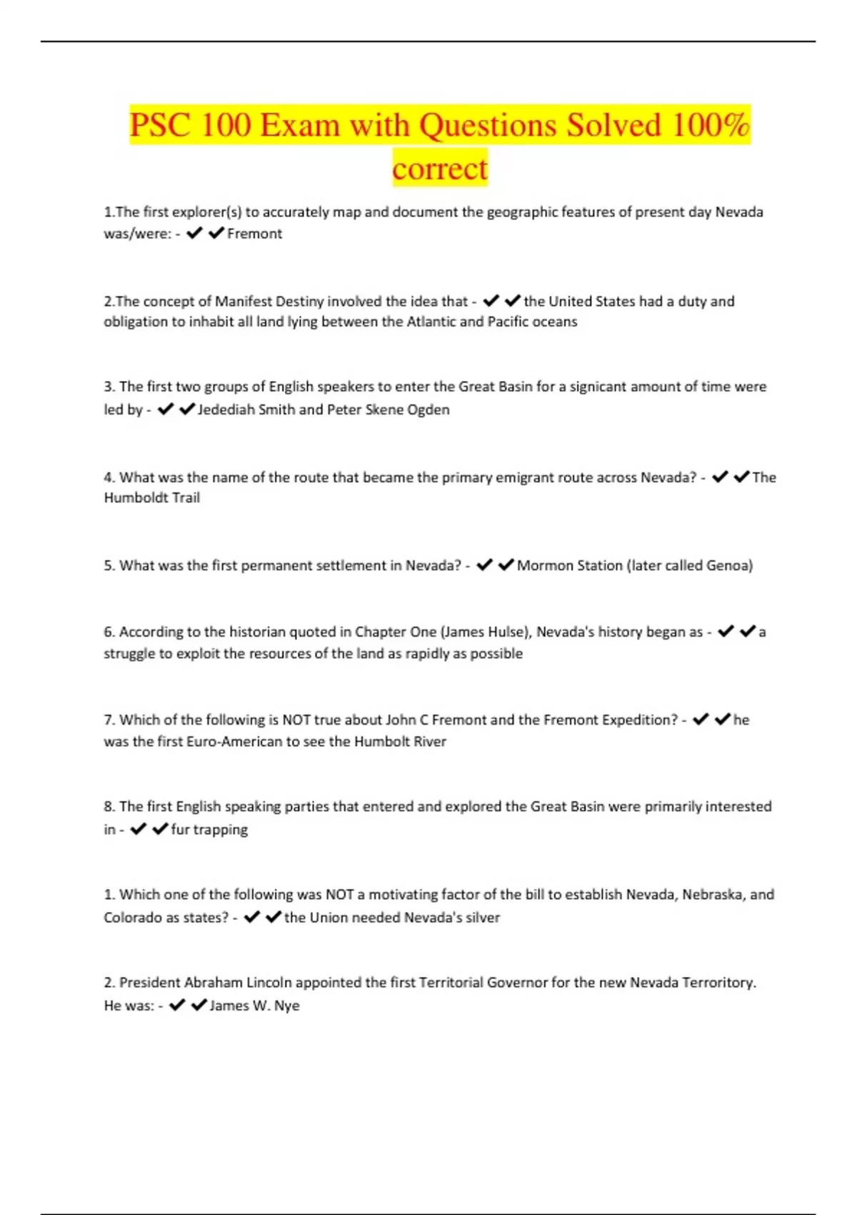 .The first explorer(s) to accurately map and document the geographic features of present day Nevada was/were: - Fremont 2.The concept of Manifest Destiny involved the idea that - the United States had a duty and obligation to inhabit all land lying between the Atlantic and Pacific oceans 3. The first two groups of English speakers to enter the Great Basin for a signicant amount of time were led by - Jedediah Smith and Peter Skene Ogden 4. What was the name of the route that became the primary emigrant route across Nevada? - The Humboldt Trail 5. What was the first permanent settlement in Nevada? - Mormon Station (later called Genoa) 6. According to the historian quoted in Chapter One (James Hulse), Nevada's history began as - a struggle to exploit the resources of the land as rapidly as possible 7. Which of the following is NOT true about John C Fremont and the Fremont Expedition? - he was the first Euro-American to see the Humbolt River 8. The first English speaking parties that entered and explored the Great Basin were primarily interested in - fur trapping 1. Which one of the following was NOT a motivating factor of the bill to establish Nevada, Nebraska, and Colorado as states? - the Union needed Nevada's silver 2. President Abraham Lincoln appointed the first Territorial Go