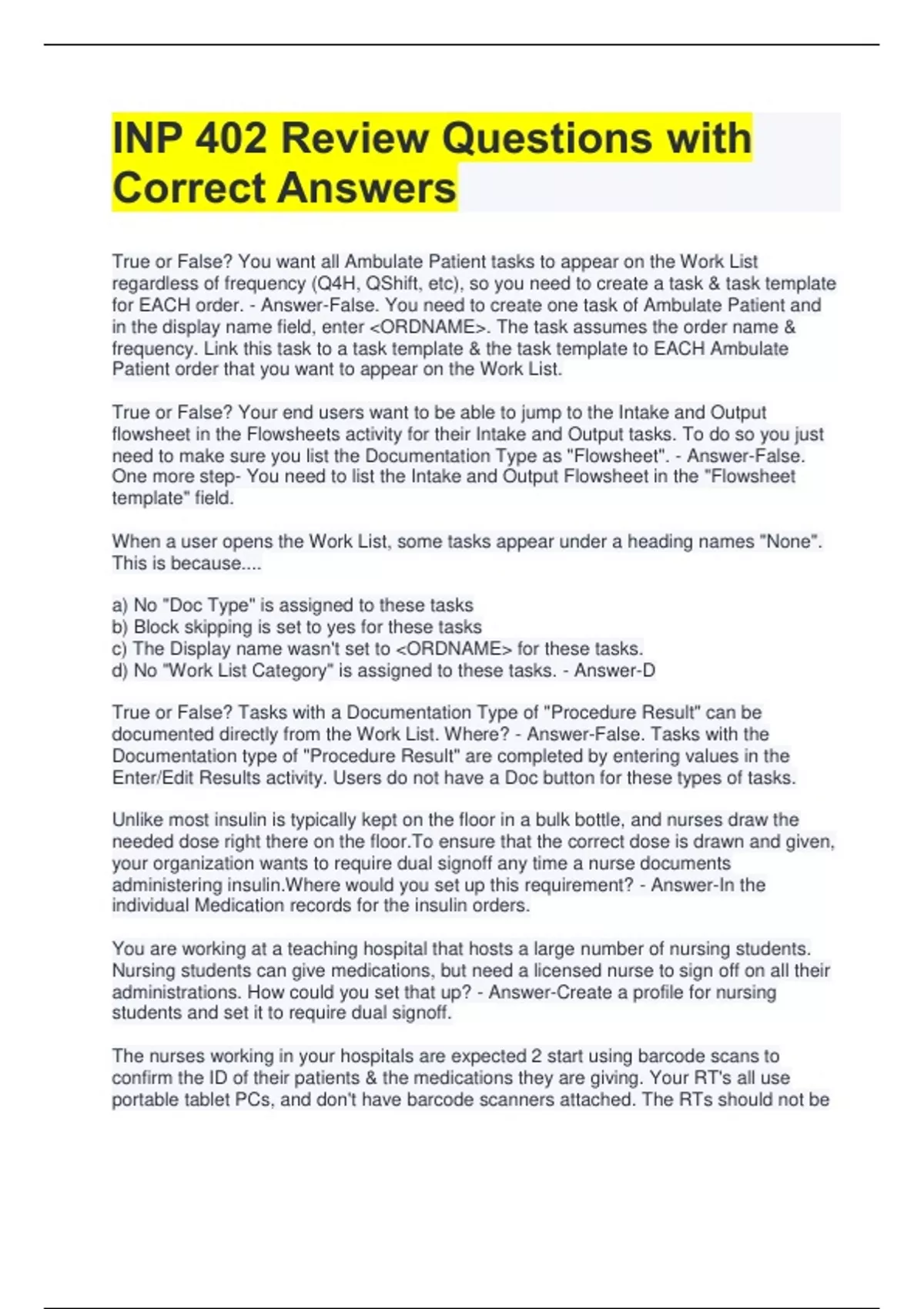 INP 402 Review Questions with Correct Answers True or False? You want all Ambulate Patient tasks to appear on the Work List regardless of frequency (Q4H, QShift, etc), so you need to create a task & task template for EACH order. - Answer-False. You need to create one task of Ambulate Patient and in the display name field, enter ORDNAME. The task assumes the order name & frequency. Link this task to a task template & the task template to EACH Ambulate Patient order that you want to appear on the Work List. True or False? Your end users want to be able to jump to the Intake and Output flowsheet in the Flowsheets activity for their Intake and Output tasks. To do so you just need to make sure you list the Documentation Type as "Flowsheet". - Answer-False. One more step- You need to list the Intake and Output Flowsheet in the "Flowsheet template" field. When a user opens the Work List, some tasks appear under a heading names "None". This is because.... a) No "Doc Type" is assigned to these tasks b) Block skipping is set to yes for these tasks c) The Display name wasn't set to ORDNAME for these tasks. d) No "Work List Category" is assigned to these tasks. - Answer-D True or False? Tasks with a Documentation Type of "Procedure Result" can be documented directly from the Work List. Where? - Answer-False. Tasks with the Documentation type of "Procedure Result" are completed by entering values in the Enter/Edit Results activity. Users do not have a Doc button for these types of tasks. Unlike most insulin is typically kept on the floor in a bulk bottle, and nurses draw the needed dose right there on the floor.To ensure that the correct dose is drawn and given, your organization wants to require dual signoff any time a nurse documents administering insulin.Where would you set up this requirement? - Answer-In the individual Medication records for the insulin orders. You are working at a teaching hospital that hosts a large number of nursing students. Nursing students can give medications, but need a licensed nurse to sign off on all their administrations. How could you set that up? - Answer-Create a profile for nursing students and set it to require dual signoff.