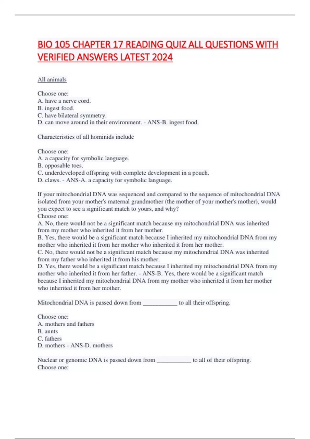 BIO 105 CHAPTER 17 READING QUIZ ALL QUESTIONS WITH VERIFIED ANSWERS LATEST 2024 All animals Choose one: A. have a nerve cord. B. ingest food. C. have bilateral symmetry. D. can move around in their environment. - ANS-B. ingest food. Characteristics of all hominids include Choose one: A. a capacity for symbolic language. B. opposable toes. C. underdeveloped offspring with complete development in a pouch. D. claws. - ANS-A. a capacity for symbolic language. If your mitochondrial DNA was sequenced and compared to the sequence of mitochondrial DNA isolated from your mother's maternal grandmother (the mother of your mother's mother), would you expect to see a significant match to yours, and why? Choose one: A. No, there would not be a significant match because my mitochondrial DNA was inherited from my mother who inherited it from her mother. B. Yes, there would be a significant match because I inherited my mitochondrial DNA from my mother who inherited it from her mother who inherited it from her mother. C. No, there would not be a significant match because my mitochondrial DNA was inherited from my father who inherited it from his mother. D. Yes, there would be a significant match because I inherited my mitochondrial DNA from my mother who inherited it from her father. - ANS-B. Yes, there would be a significant match because I inherited my mitochondrial DNA from my mother who inherited it from her mother who inherited it from her mother. Mitochondrial DNA is passed down from ___________ to all their offspring. Choose one: A. mothers and fathers B. aunts C. fathers D. mothers - ANS-D. mothers Nuclear or genomic DNA is passed down from ___________ to all of their offspring. Choose one: A. fathers B. aunts and uncle
