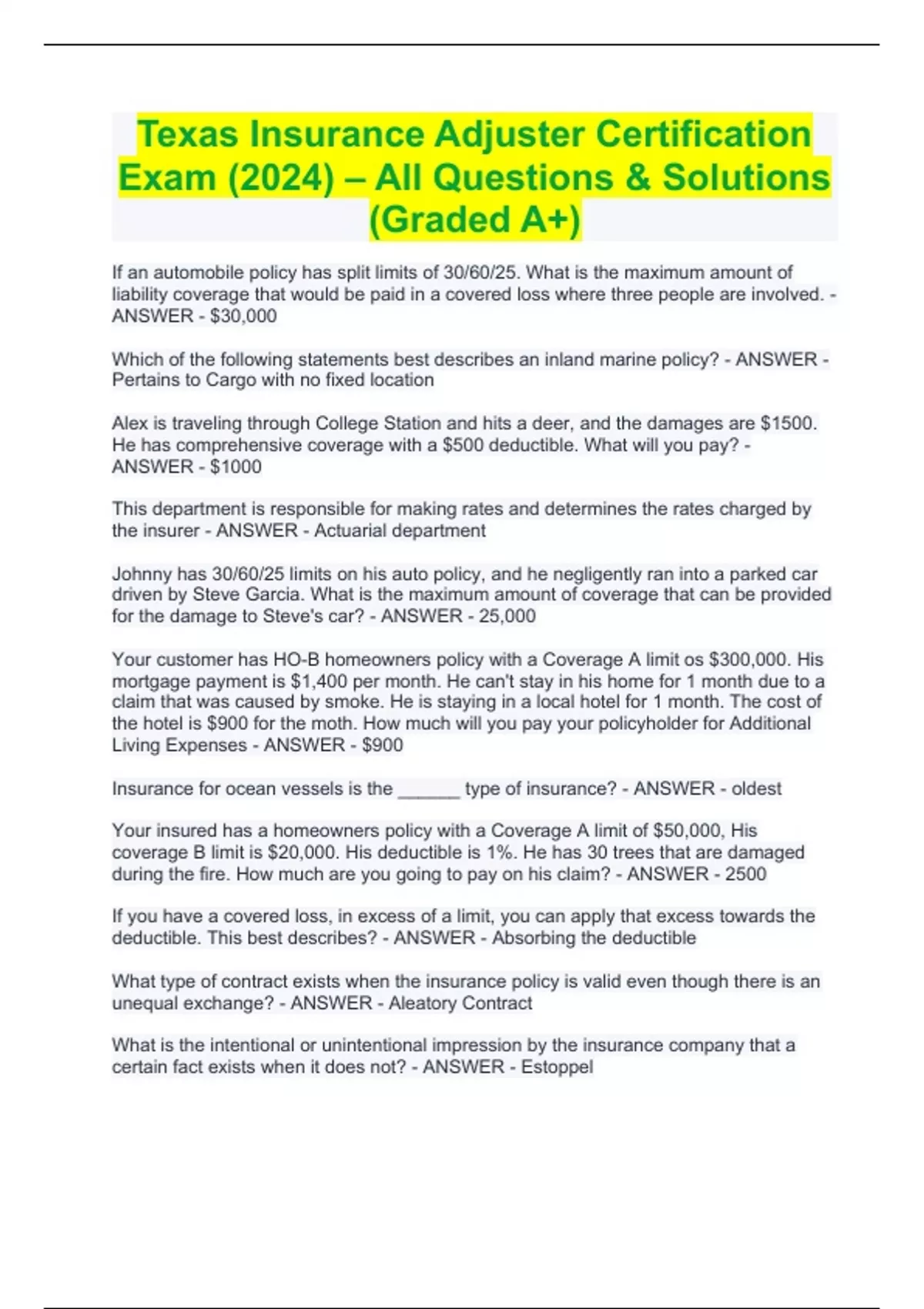 Texas Insurance Adjuster Certification Exam (2024) – All Questions & Solutions (Graded A+) Texas Insurance Adjuster Certification Exam (2024) – All Questions & Solutions (Graded A+) If an automobile policy has split limits of 30/60/25. What is the maximum amount of liability coverage that would be paid in a covered loss where three people are involved. - ANSWER - $30,000 Which of the following statements best describes an inland marine policy? - ANSWER - Pertains to Cargo with no fixed location Alex is traveling through College Station and hits a deer, and the damages are $1500. He has comprehensive coverage with a $500 deductible. What will you pay? - ANSWER - $1000 This department is responsible for making rates and determines the rates charged by the insurer - ANSWER - Actuarial department Johnny has 30/60/25 limits on his auto policy, and he negligently ran into a parked car driven by Steve Garcia. What is the maximum amount of coverage that can be provided for the damage to Steve's car? - ANSWER - 25,000 Your customer has HO-B homeowners policy with a Coverage A limit os $300,000. His mortgage payment is $1,400 per month. He can't stay in his home for 1 month due to a claim that was caused by smoke. He is staying in a local hotel for 1 month. The cost of the hotel is $900 for the moth. How much will you pay your policyholder for Additional Living Expenses - ANSWER - $900 Insurance for ocean vessels is the ______ type of insurance? - ANSWER - oldest Your insured has a homeowners policy with a Coverage A limit of $50,000, His coverage B limit is $20,000. His deductible is 1%. He has 30 trees that are damaged during the fire. How much are you going to pay on his claim? - ANSWER - 2500 If you have a covered loss, in excess of a limit, you can apply that excess towards the deductible. This best describes? - ANSWER - Absorbing the deductible What type of contract exists when the insurance policy is valid even though there is an unequal exchange? - ANSWER - Aleatory Contract What is the intentional or unintentional impression by the insurance company that a certain fact exists when it does not? - ANSWER - Estoppel An event that results in an insured loss / damages. - ANSWER - Occurrence