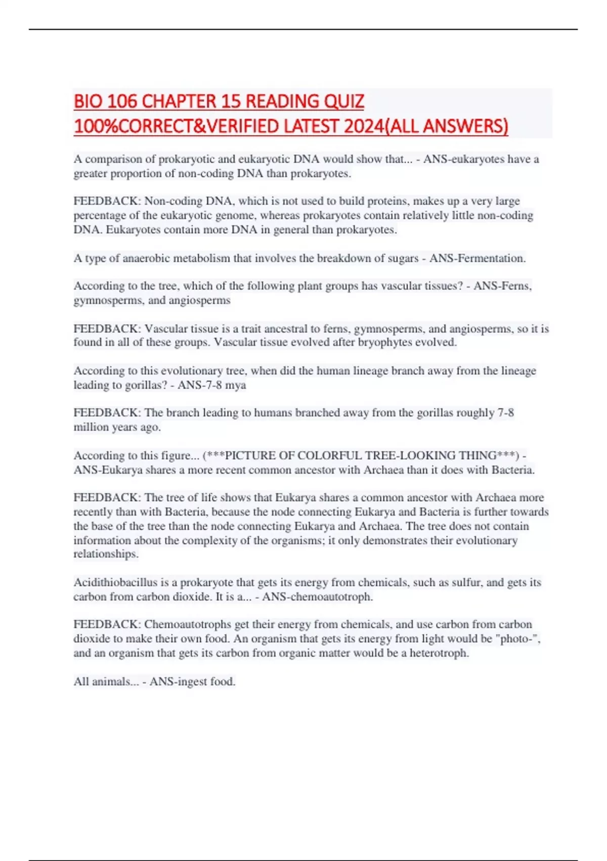 BIO 106 CHAPTER 15 READING QUIZ 100%CORRECT&VERIFIED LATEST 2024(ALL ANSWERS) A comparison of prokaryotic and eukaryotic DNA would show that... - ANS-eukaryotes have a greater proportion of non-coding DNA than prokaryotes. FEEDBACK: Non-coding DNA, which is not used to build proteins, makes up a very large percentage of the eukaryotic genome, whereas prokaryotes contain relatively little non-coding DNA. Eukaryotes contain more DNA in general than prokaryotes. A type of anaerobic metabolism that involves the breakdown of sugars - ANS-Fermentation. According to the tree, which of the following plant groups has vascular tissues? - ANS-Ferns, gymnosperms, and angiosperms FEEDBACK: Vascular tissue is a trait ancestral to ferns, gymnosperms, and angiosperms, so it is found in all of these groups. Vascular tissue evolved after bryophytes evolved. According to this evolutionary tree, when did the human lineage branch away from the lineage leading to gorillas? - ANS-7-8 mya FEEDBACK: The branch leading to humans branched away from the gorillas roughly 7-8 million years ago. According to this figure... (***PICTURE OF COLORFUL TREE-LOOKING THING***) - ANS-Eukarya shares a more recent common ancestor with Archaea than it does with Bacteria. FEEDBACK: The tree of life shows that Eukarya shares a common ancestor with Archaea more recently than with Bacteria, because the node connecting Eukarya and Bacteria is further towards the base of the tree than the node connecting Eukarya and Archaea. The tree does not contain information about the complexity of the organisms; it only demonstrates their evolutionary relationships. Acidithiobacillus is a prokaryote that gets its energy from chemicals, such as sulfur, and gets its carbon from carbon dioxide. It is a... - ANS-chemoautotroph. FEEDBACK: Chemoautotrophs get their energy from chemicals, and use carbon from carbon dioxide to make their own food. An organism that gets its energy from light would be "photo-", and an organism that gets its carbon from organic matter would be a heterotroph. All animals... - AN