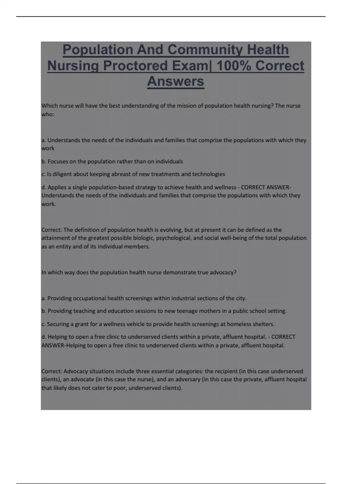 Population And Community Health Nursing Proctored Exam| 100% Correct Answers Which nurse will have the best understanding of the mission of population health nursing? The nurse who: a. Understands the needs of the individuals and families that comprise the populations with which they work b. Focuses on the population rather than on individuals c. Is diligent about keeping abreast of new treatments and technologies d. Applies a single population-based strategy to achieve health and wellness - CORRECT ANSWERUnderstands the needs of the individuals and families that comprise the populations with which they work. Correct: The definition of population health is evolving, but at present it can be defined as the attainment of the greatest possible biologic, psychological, and social well-being of the total population as an entity and of its individual members.