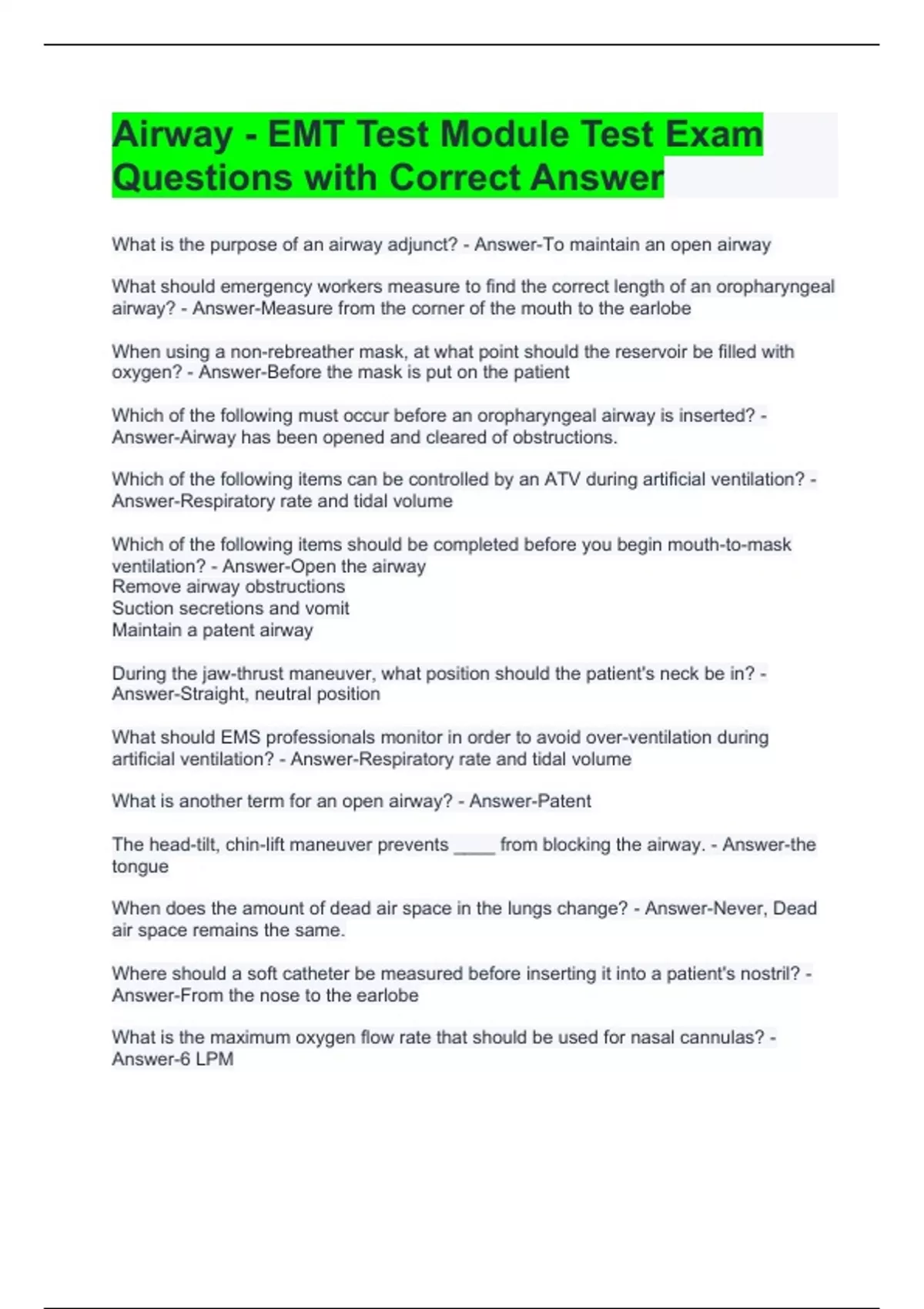 Airway - EMT Test Module Test Exam Questions with Correct Answer During mouth-to-mask ventilation, how much oxygen is exhaled from the rescuer to the patient? - Answer-16% How long can an adult patient be suctioned at one time? - Answer-Up to 15 seconds What is the purpose of applying cricoid pressure during artificial ventilation? - Answer-To guide air into the trachea instead of the esophagus When should the jaw-thrust maneuver be used to open the airway? - Answer-When the patient is suspected of having a neck or head injury Respiratory arrest occurs when ____. - Answer-The patient stops breathing completely What is the farthest that a rigid catheter should be inserted into a patient's mouth? - Answer-Base of the tongue