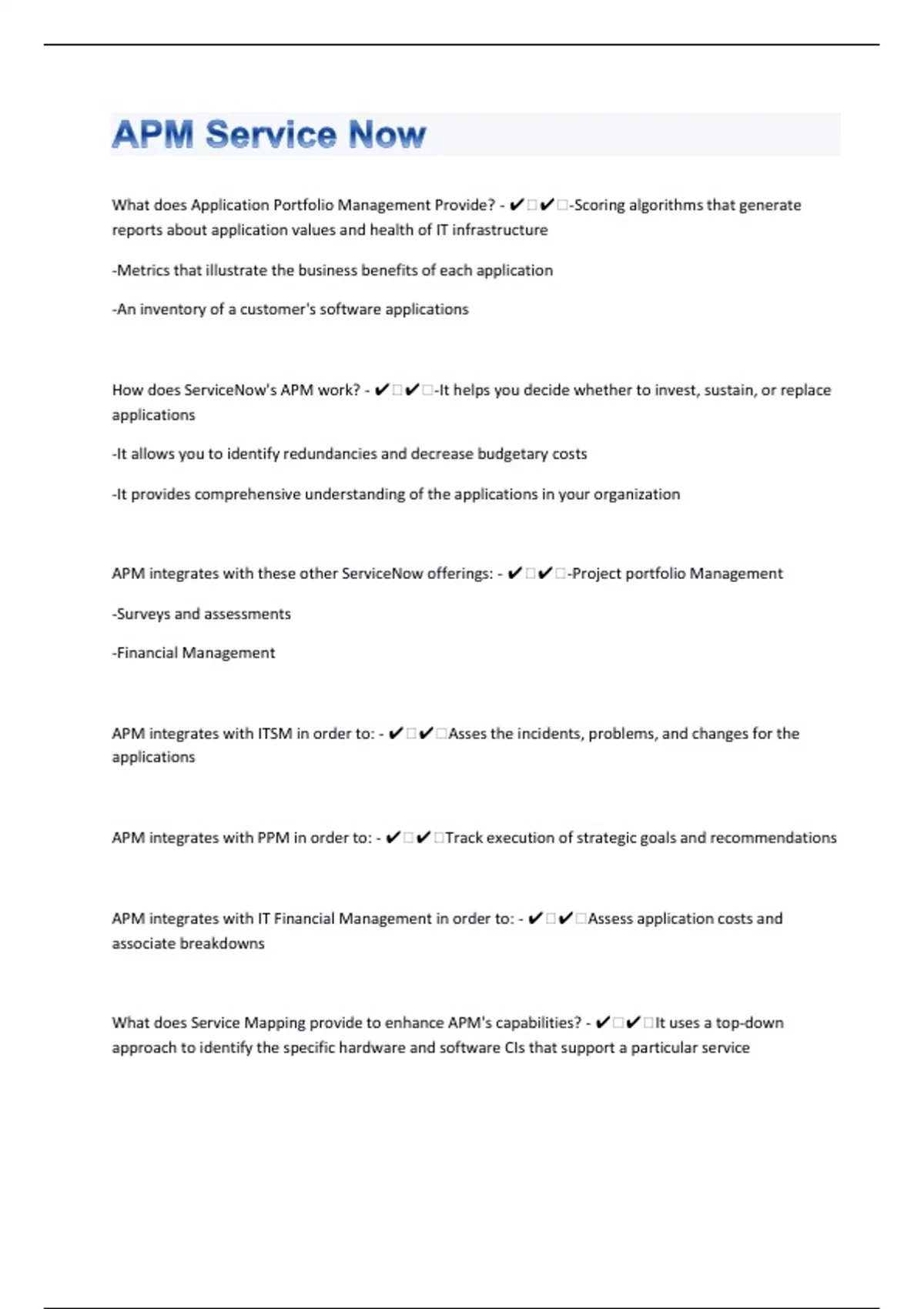What does Application Portfolio Management Provide? - ️️-Scoring algorithms that generate reports about application values and health of IT infrastructure -Metrics that illustrate the business benefits of each application -An inventory of a customer's software applications How does ServiceNow's APM work? - ️️-It helps you decide whether to invest, sustain, or replace applications -It allows you to identify redundancies and decrease budgetary costs -It provides comprehensive understanding of the applications in your organization APM integrates with these other ServiceNow offerings: - ️️-Project portfolio Management -Surveys and assessments -Financial Management APM integrates with ITSM in order to: - ️️Asses the incidents, problems, and changes for the applications APM integrates with PPM in order to: - ️️Track execution of strategic goals and recommendations APM integrates with IT Financial Management in order to: - ️️Assess application costs and associate breakdowns What does Service Mapping provide to enhance APM's capabilities? - ️️It uses a top-down approach to identify the specific hardware and software CIs that support a particular service