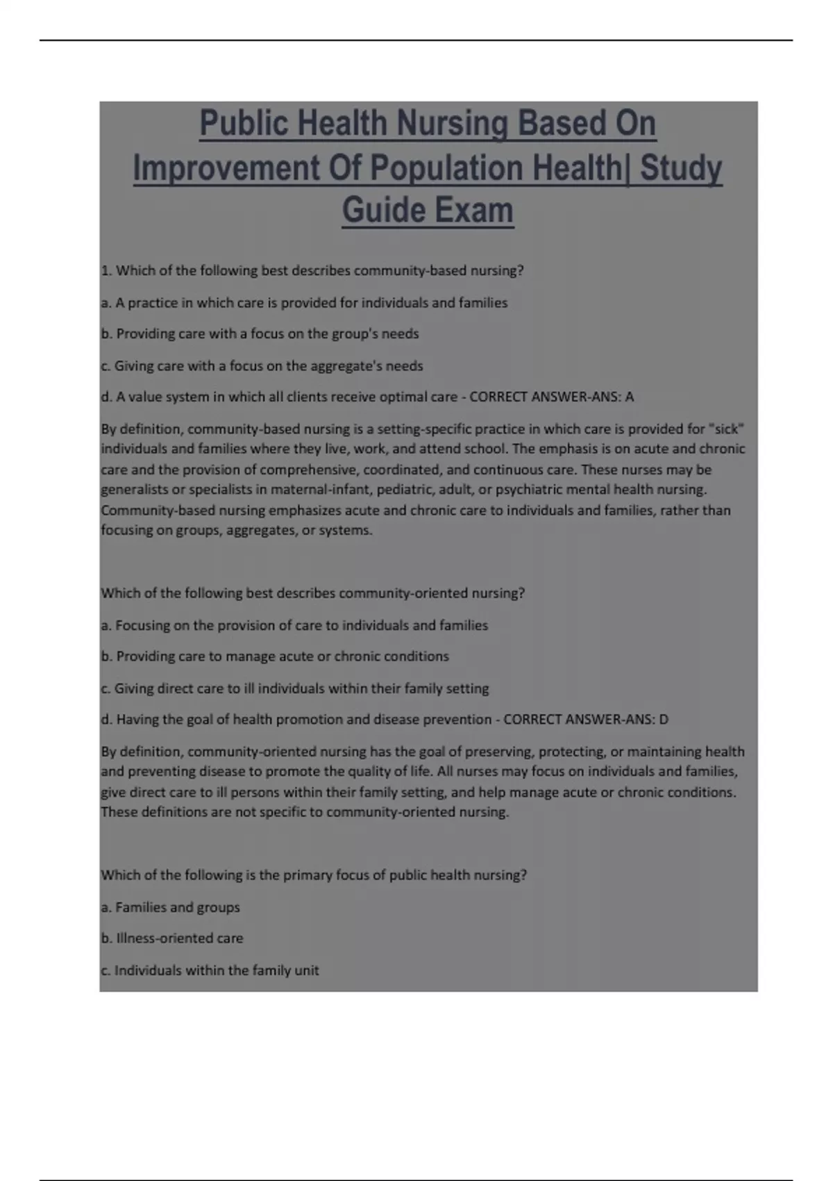 Public Health Nursing Based On Improvement Of Population Health| Study Guide Exam 1. Which of the following best describes community-based nursing? a. A practice in which care is provided for individuals and families b. Providing care with a focus on the group's needs c. Giving care with a focus on the aggregate's needs d. A value system in which all clients receive optimal care - CORRECT ANSWER-ANS: A By definition, community-based nursing is a setting-specific practice in which care is provided for "sick" individuals and families where they live, work, and attend school. The emphasis is on acute and chronic care and the provision of comprehensive, coordinated, and continuous care. These nurses may be generalists or specialists in maternal-infant, pediatric, adult, or psychiatric mental health nursing. Community-based nursing emphasizes acute and chronic care to individuals and families, rather than focusing on groups, aggregates, or systems. Which of the following best describes community-oriented nursing? a. Focusing on the provision of care to individuals and families b. Providing care to manage acute or chronic conditions c. Giving direct care to ill individuals within their family setting d. Having the goal of health promotion and disease prevention - CORRECT ANSWER-ANS: D By definition, community-oriented nursing has the goal of preserving, protecting, or maintaining health and preventing disease to promote the quality of life. All nurses may focus on individuals and families, give direct care to ill persons within their family setting, and help manage acute or chronic conditions. These definitions are not specific to community-oriented nursing.
