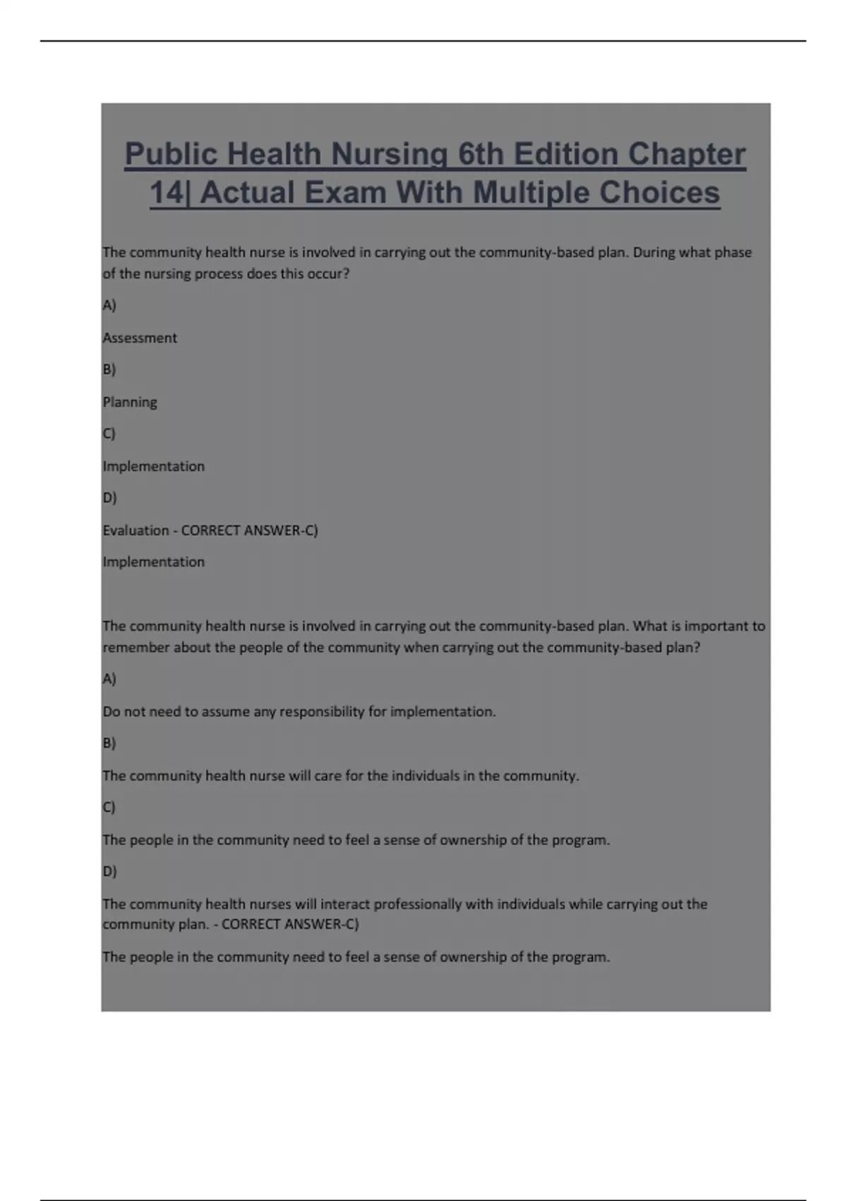 Public Health Nursing 6th Edition Chapter 14| Actual Exam With Multiple Choices The community health nurse is involved in carrying out the community-based plan. During what phase of the nursing process does this occur? A) Assessment B) Planning C) Implementation D) Evaluation - CORRECT ANSWER-C) Implementation The community health nurse is involved in carrying out the community-based plan. What is important to remember about the people of the community when carrying out the community-based plan? A) Do not need to assume any responsibility for implementation. B) The community health nurse will care for the individuals in the community. C) The people in the community need to feel a sense of ownership of the program. D) The community health nurses will interact professionally with individuals while carrying out the community plan. - CORRECT ANSWER-C