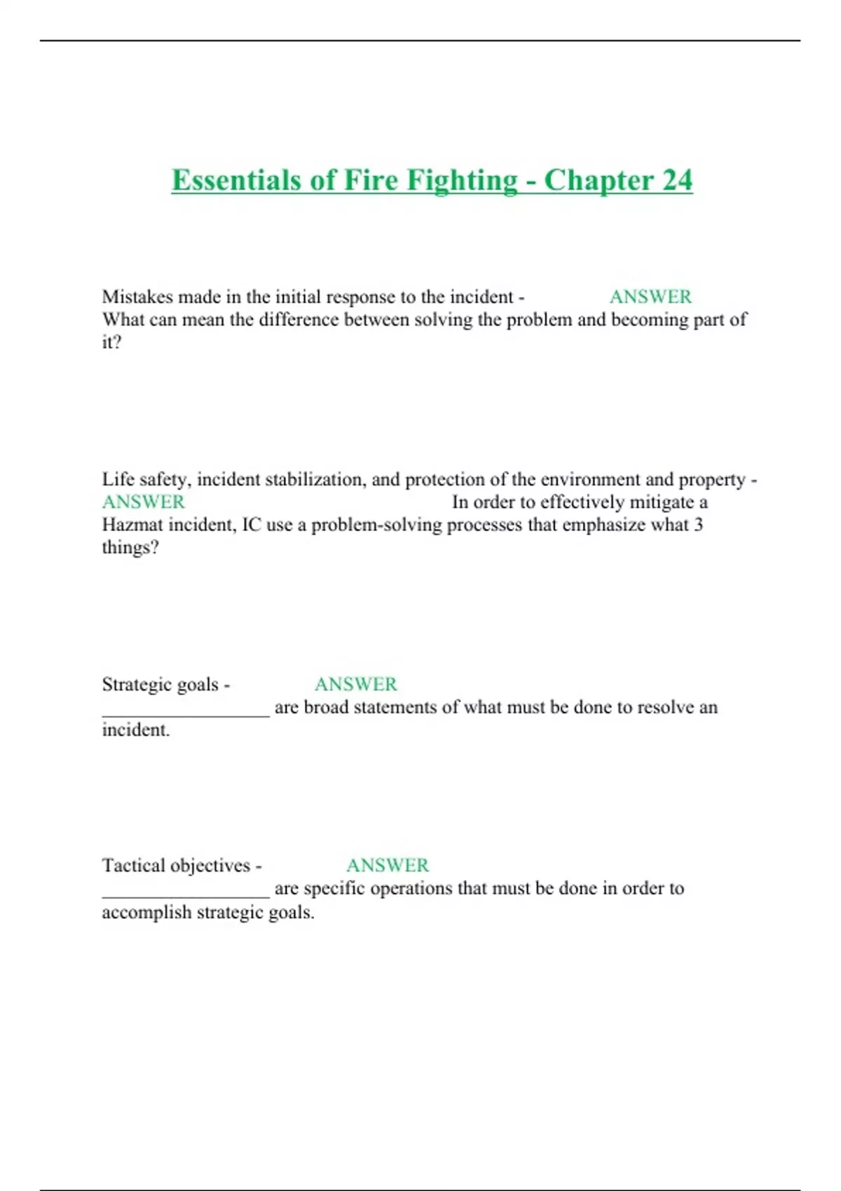 Essentials of Fire Fighting - Chapter 24 Mistakes made in the initial response to the incident - ANSWER What can mean the difference between solving the problem and becoming part of it? Life safety, incident stabilization, and protection of the environment and property - ANSWER In order to effectively mitigate a Hazmat incident, IC use a problem-solving processes that emphasize what 3 things? Strategic goals - ANSWER _________________ are broad statements of what must be done to resolve an incident. Tactical objectives - ANSWER _________________ are specific operations that must be done in order to accomplish strategic goals.