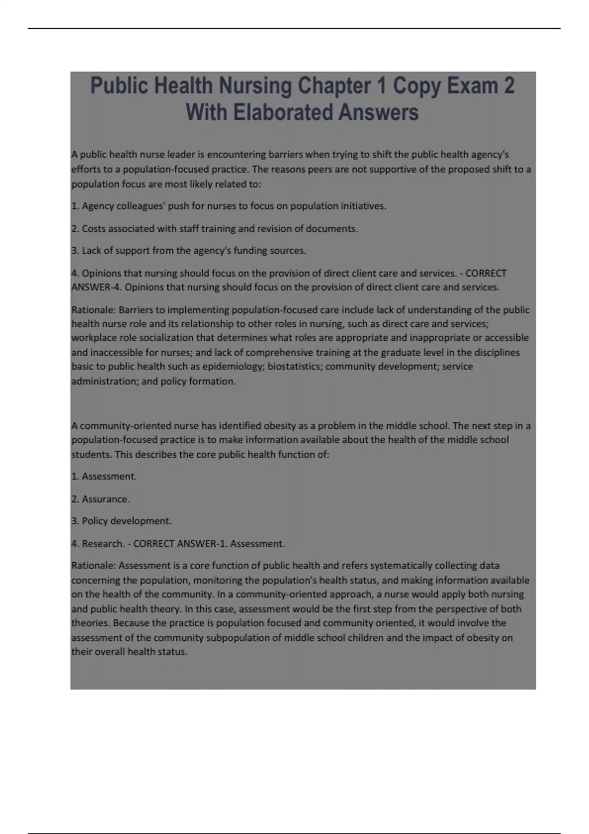 Public Health Nursing Chapter 1 Copy Exam 2 With Elaborated Answers A public health nurse leader is encountering barriers when trying to shift the public health agency's efforts to a population-focused practice. The reasons peers are not supportive of the proposed shift to a population focus are most likely related to: 1. Agency colleagues' push for nurses to focus on population initiatives. 2. Costs associated with staff training and revision of documents. 3. Lack of support from the agency's funding sources. 4. Opinions that nursing should focus on the provision of direct client care and services. - CORRECT ANSWER-4. Opinions that nursing should focus on the provision of direct client care and services. Rationale: Barriers to implementing population-focused care include lack of understanding of the public health nurse role and its relationship to other roles in nursing, such as direct care and services; workplace role socialization that determines what roles are appropriate and inappropriate or accessible and inaccessible for nurses; and lack of comprehensive training at the graduate level in the disciplines basic to public health such as epidemiology; biostatistics; community development; service administration; and policy formation