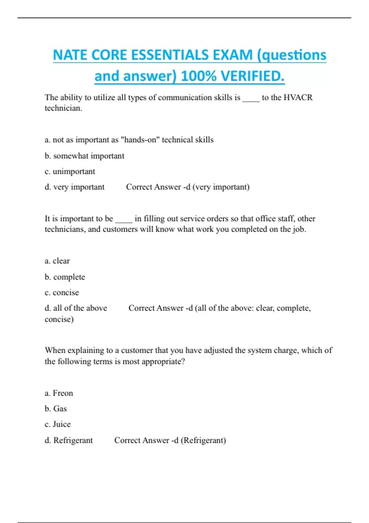 NATE CORE ESSENTIALS EXAM (questions and answer) 100% VERIFIED.
