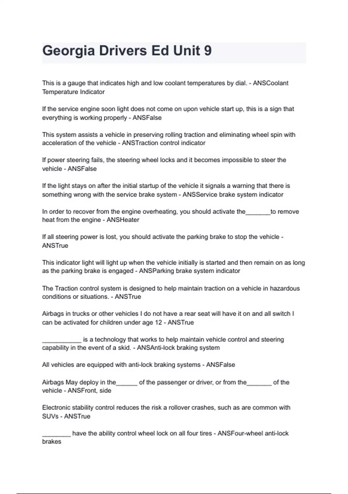 Georgia Drivers Ed Unit 9 A+ score assured (100% verified) 2024/2025