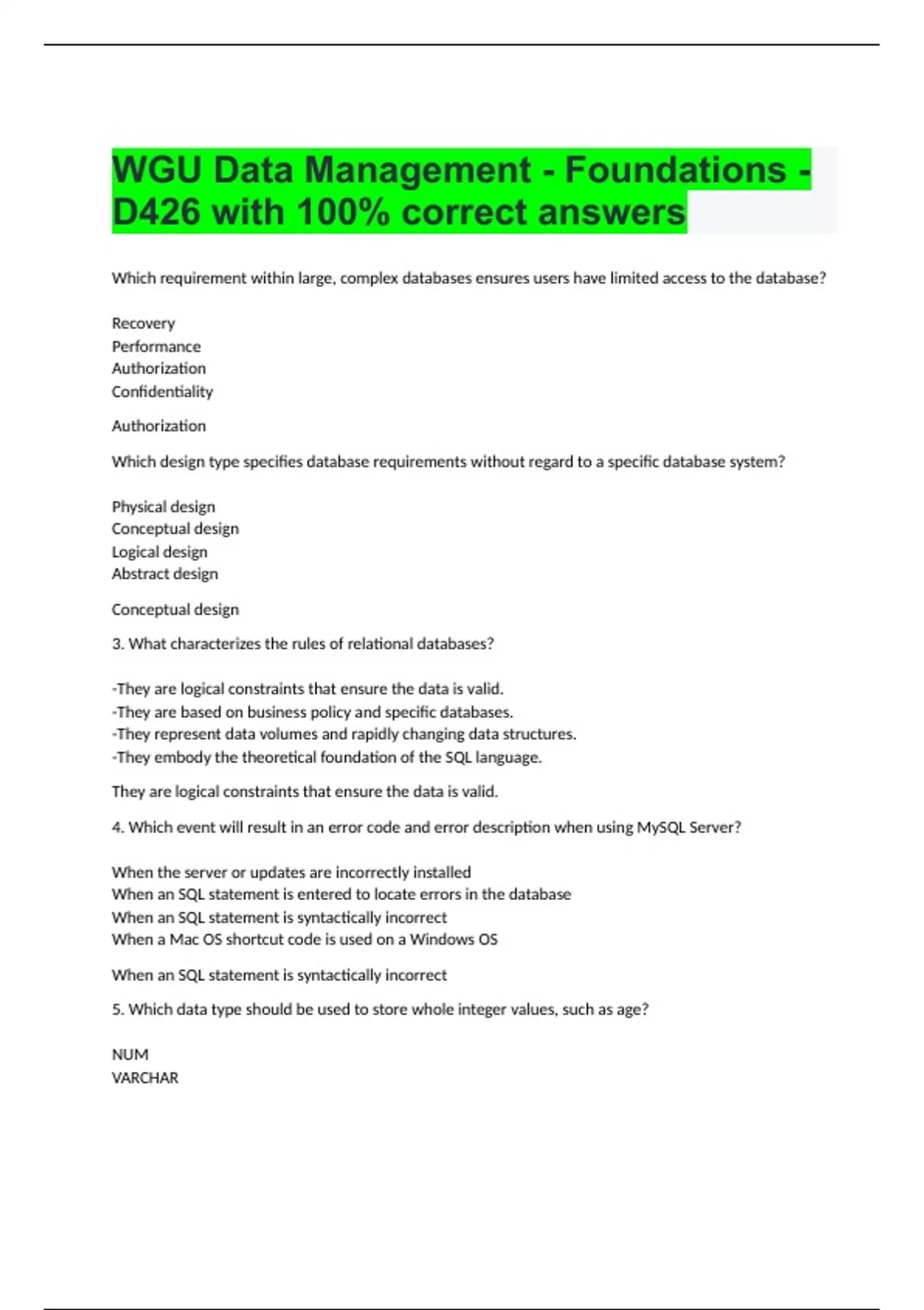 Which requirement within large, complex databases ensures users have limited access to the database? Recovery Performance Authorization Confidentiality Authorization Which design type specifies database requirements without regard to a specific database system? Physical design Conceptual design Logical design Abstract design Conceptual design 3. What characterizes the rules of relational databases? -They are logical constraints that ensure the data is valid. -They are based on business policy and specific databases. -They represent data volumes and rapidly changing data structures. -They embody the theoretical foundation of the SQL language. They are logical constraints that ensure the data is valid. 4. Which event will result in an error code and error description when using MySQL Server? When the server or updates are incorrectly installed When an SQL statement is entered to locate errors in the database When an SQL statement is syntactically incorrect When a Mac OS shortcut code is used on a Windows OS When an SQL statement is syntactically incorrect 5. Which data type should be used to store whole integer values, such as age? NUM VARCHAR DATE INT INT 6. Which text-based interface is included in the MySQL Server Download? MySQL Command-Line Client MySQL Workbench MySQL Enterprise MySQL Community MySQL Command-Line Client 7. Which database system includes the World database during its installation? MySQL MongoDB Oracle PostgreSQL MySQL 8. What is the standardized language of relational database systems? Contextual Query Language Structured Query Language Select Query Language Object Query Language Structured Query Language 9. Which SQL sublanguage is used to manage database access? Data Definition Language (DDL) Data Query Language (DQL) Data Manipulation Language (DML) Data Control Language (DCL) Data Control Language (DCL) 10. Which SQL sublanguage is used to roll back database changes? Data Transaction Language (DTL) Data Manipulation Language (DML) Data Query Language (DQL) Data Control Language (DCL) Data Transaction Language (DTL) 11. Which format is used by the TIME data type in MySQL? YYYY-MM-DD YYYY-MM-DD hh:mm:ss hh:mm:ss hh:mm:ss YYYY-MM-DD hh:mm:ss 12. Which MySQL operator is the last in the order of operator precedence? - OR NOT = OR 13. Which operator is used to compare columns from the left and right tables in MySQL? <= + = * = 14. Which type of join combines two tables without comparing columns? SELF EQUIJOIN OUTER CROSS CROSS