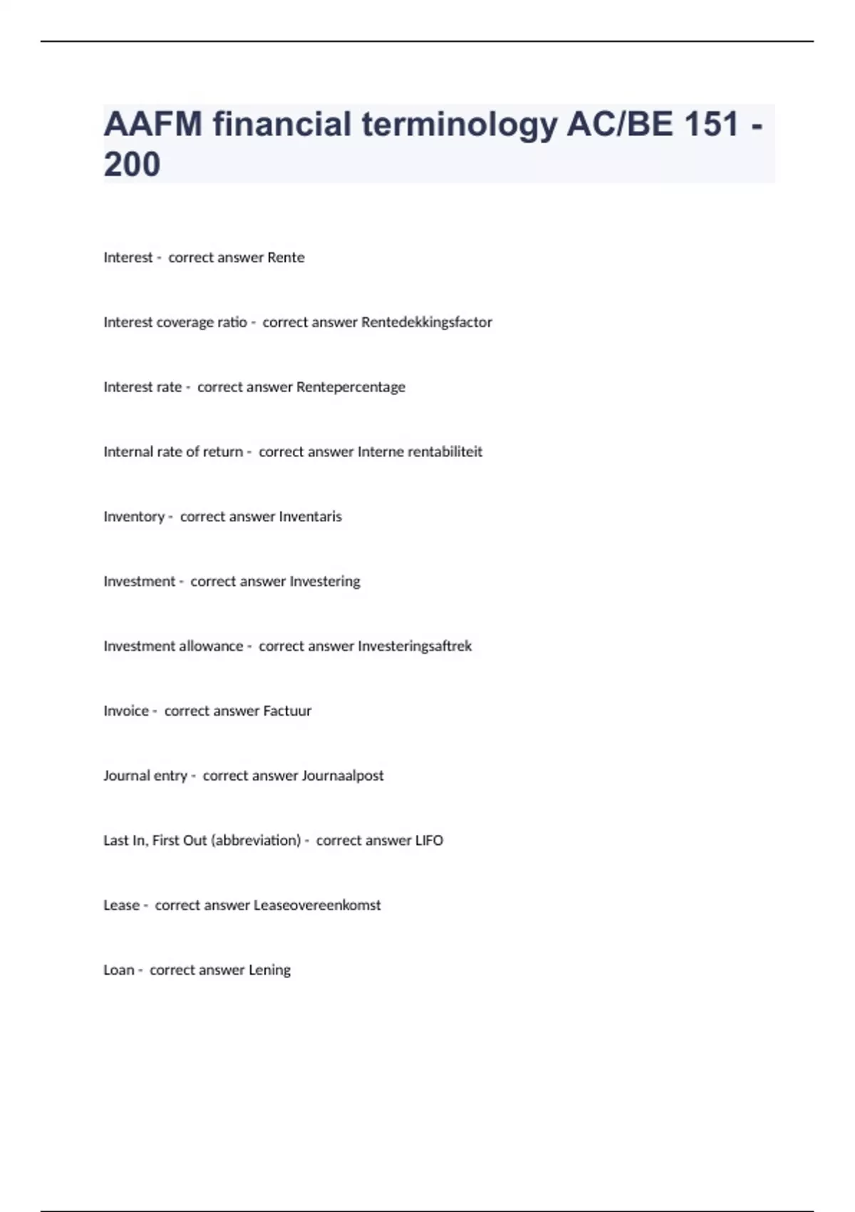 AAFM Financial Terminology AC BE 151 - 200 Final Exam Pre-Test 2024.Interest - correct answer Rente Interest coverage ratio - correct answer Rentedekkingsfactor Interest rate - correct answer Rentepercentage Internal rate of return - correct answer Interne rentabiliteit Inventory - correct answer Inventaris Investment - correct answer Investering Investment allowance - correct answer Investeringsaftrek Invoice - correct answer Factuur Journal entry - correct answer Journaalpost Last In, First Out (abbreviation) - correct answer LIFO