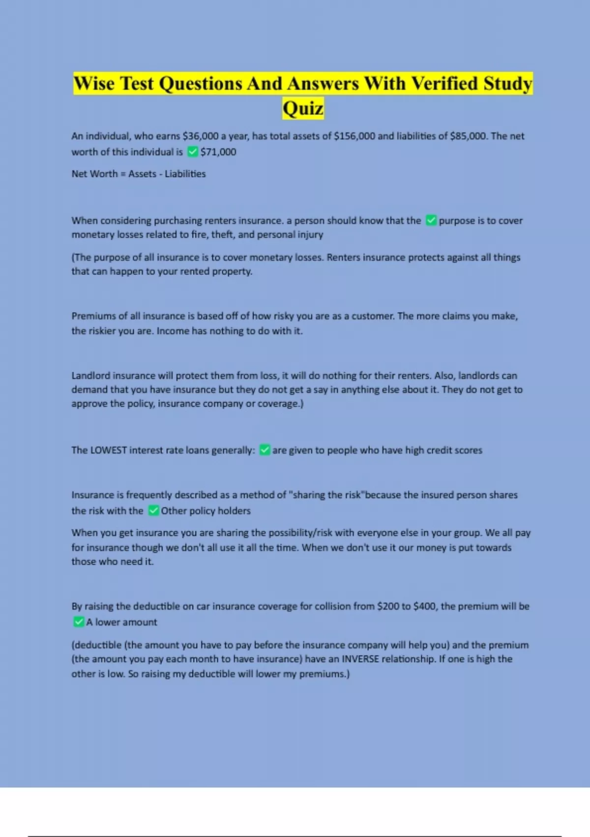 Wise Test Questions And Answers With Verified Study Quiz