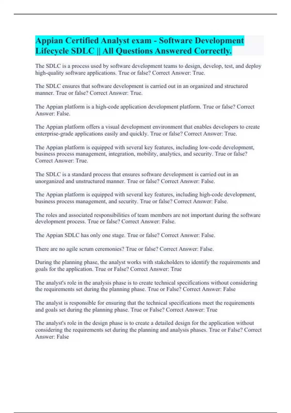 The SDLC is a process used by software development teams to design, develop, test, and deploy high-quality software applications. True or false? Correct Answer: True. The SDLC ensures that software development is carried out in an organized and structured manner. True or false? Correct Answer: True. The Appian platform is a high-code application development platform. True or false? Correct Answer: False. The Appian platform offers a visual development environment that enables developers to create enterprise-grade applications easily and quickly. True or false? Correct Answer: True. The Appian platform is equipped with several key features, including low-code development, business process management, integration, mobility, analytics, and security. True or false? Correct Answer: True. The SDLC is a standard process that ensures software development is carried out in an unorganized and unstructured manner. True or false? Correct Answer: False. The Appian platform is equipped with several key features, including high-code development, business process management, and security. True or false? Correct Answer: False. The roles and associated responsibilities of team members are not important during the software development process. True or false? Correct Answer: False. The Appian SDLC has only one stage. True or false? Correct Answer: False. There are no agile scrum ceremonies? True or false? Correct Answer: False. During the planning phase, the analyst works with stakeholders to identify the requirements and goals for the application. True or False? Correct Answer: True The analyst's role in the analysis phase is to create technical specifications without considering the requirements set during the planning phase. True or False? Correct Answer: False The analyst is responsible for ensuring that the technical specifications meet the requirements and goals set during the planning phase. True or False? Correct Answer: True The analyst's role in the design phase is to create a detailed design for the application without considering the requirements set during the planning and analysis phases. True or False? Correct Answer: False