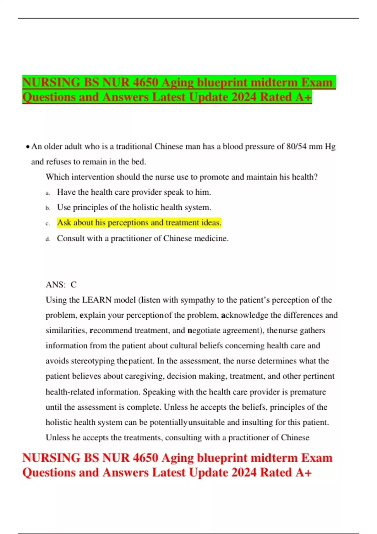 NURSING BS NUR 4650 Aging blueprint midterm Exam Questions and Answers Latest Update 2024 Rated A+