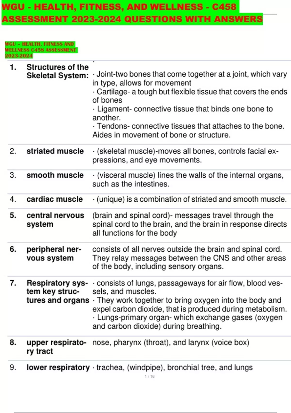 WGU – HEALTH, FITNESS AND WELLNESS C458 ASSESSMENT 1. Structures of the Skeletal System: • • Joint-two bones that come together at a joint, which vary in type, allows for movement • Cartilage- a tough but flexible tissue that covers the ends of bones • Ligament- connective tissue that binds one bone to another. • Tendons- connective tissues that attaches to the bone. Aides in movement of bone or structure. 2. striated muscle • (skeletal muscle)-moves all bones, controls facial ex- pressions, and eye movements. 3. smooth muscle • (visceral muscle) lines the walls of the internal organs, such as the intestines. 4. cardiac muscle • (unique) is a combination of striated and smooth muscle. 5. central nervous system 6. peripheral ner- vous system 7. Respiratory sys- tem key struc- tures and organs 8. upper respirato- ry tract (brain and spinal cord)- messages travel through the spinal cord to the brain, and the brain in response directs all functions for the body consists of all nerves outside the brain and spinal cord. They relay messages between the CNS and other areas of the body, including sensory organs. • consists of lungs, passageways for air flow, blood ves- sels, and muscles. • They work together to bring oxygen into the body and expel carbon dioxide, that is produced during metabolism. • Lungs-primary organ- which exchange gases (oxygen and carbon dioxide) during breathing. nose, pharynx (throat), and larynx (voice box) 9. lower respiratory • trachea, (windpipe), bronchial tree, and lungs